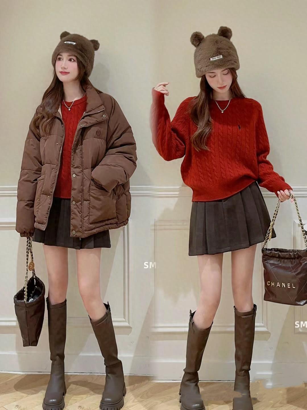 紅色針織衫作爲內搭的話,可以搭配毛呢外套、也可以搭配羽絨服。對於小個子來講,我們應該儘量搭配短款的毛呢外套、或者短款的羽絨服。