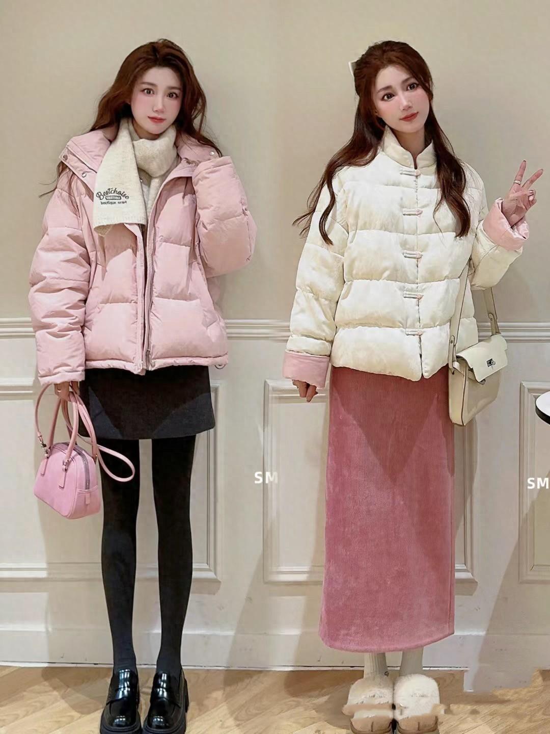 粉色系的羽絨服,或者白色系的國風外套,都屬於相對柔和的色彩。簡單大氣的款式,搭配高腰的毛呢半身裙,有一種溫柔嫺靜的美。