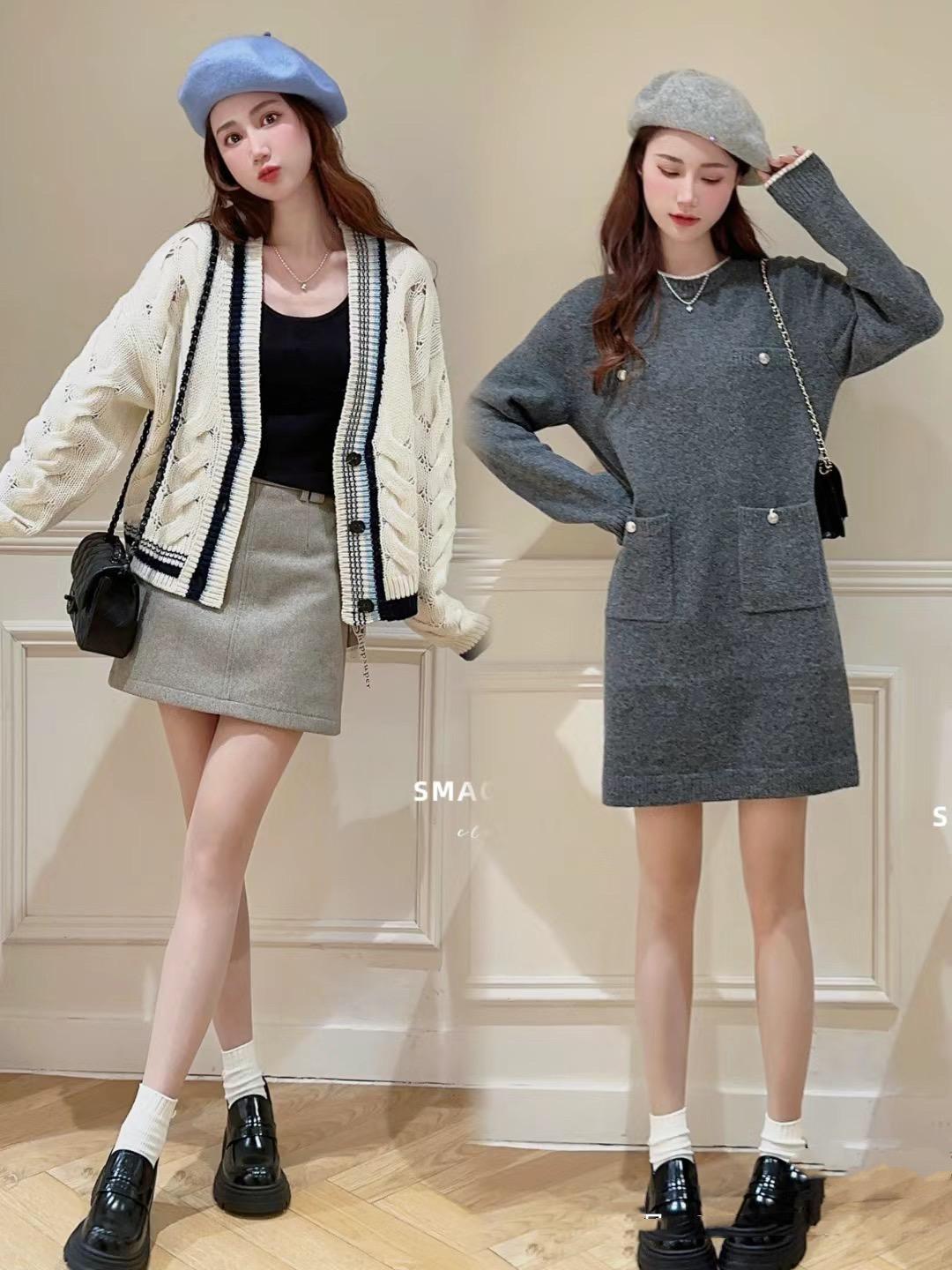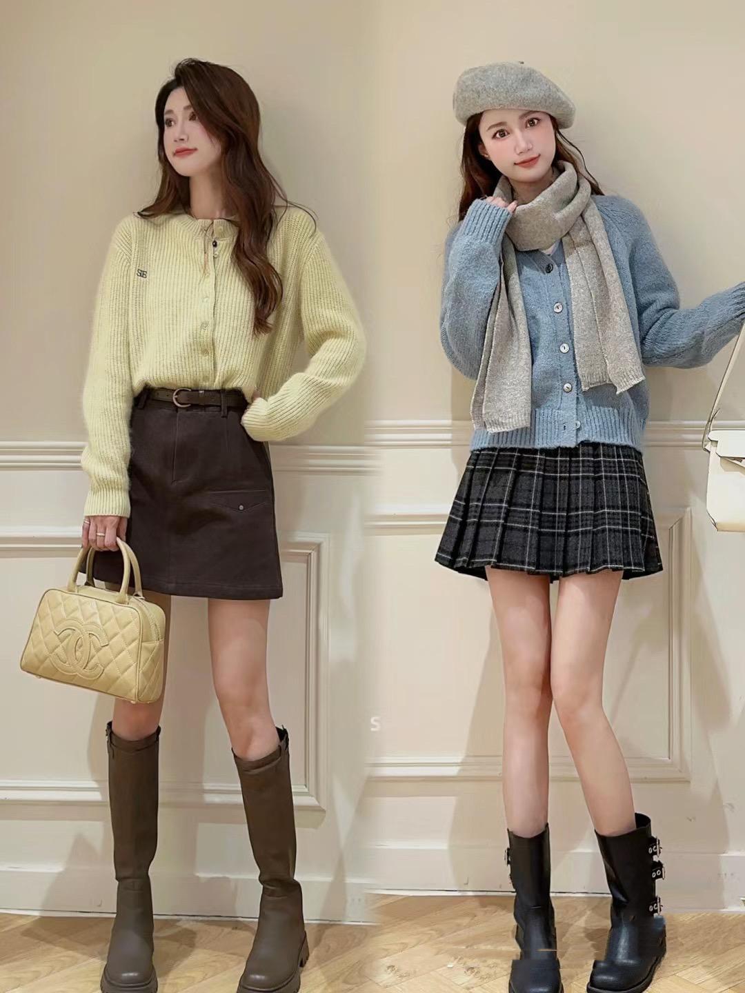色彩溫柔的針織開衫,可以配高腰的A字形半身裙、有一種大方又精緻的美。高腰的A字形半身裙,毛呢的面料更顯挺闊大氣,搭配厚底長靴也更顯高一些。