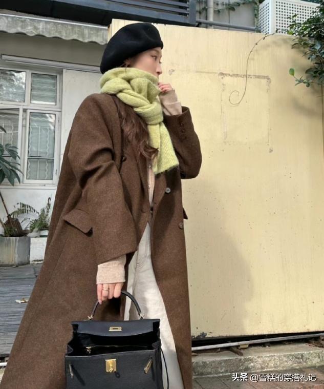 單色調的大衣並不適合搭配同色系的內搭,爲了展示色彩的遞進感,匹配的帽子,圍巾之類的小物件,可以增加色彩的立體感,彩色融入,讓人眼前一亮。