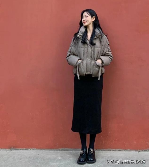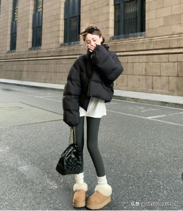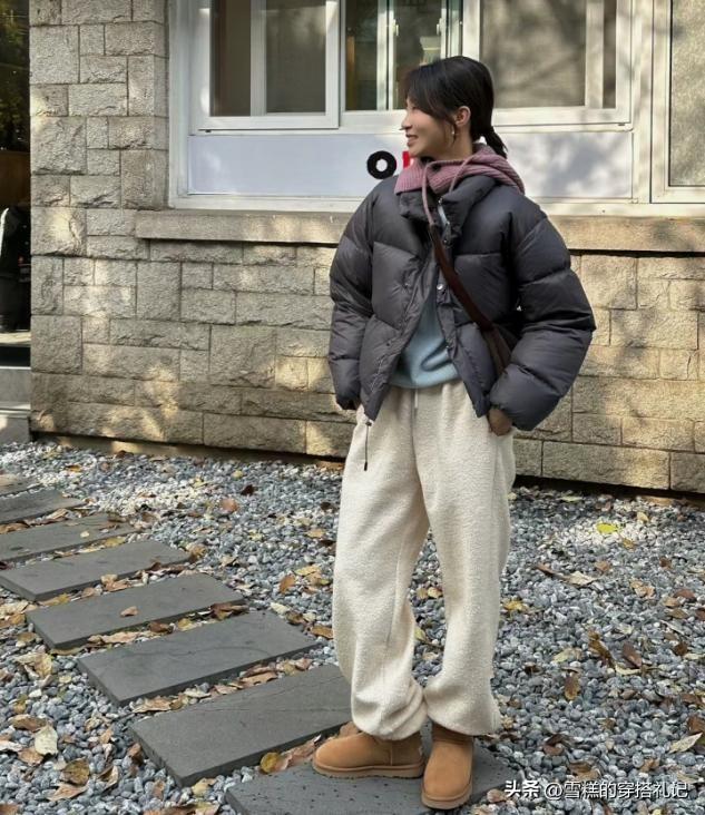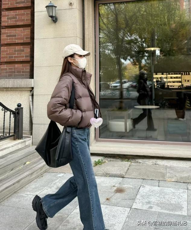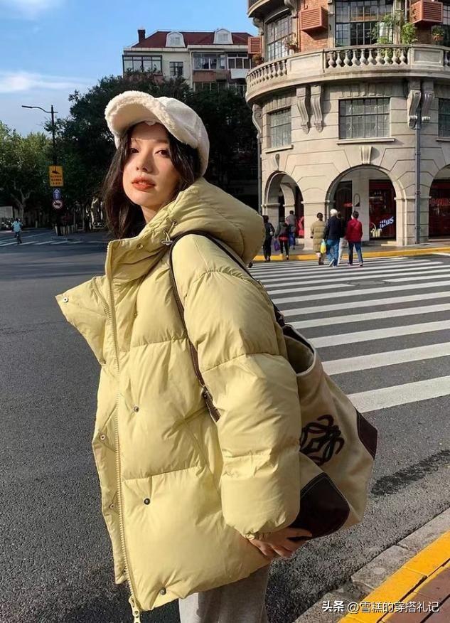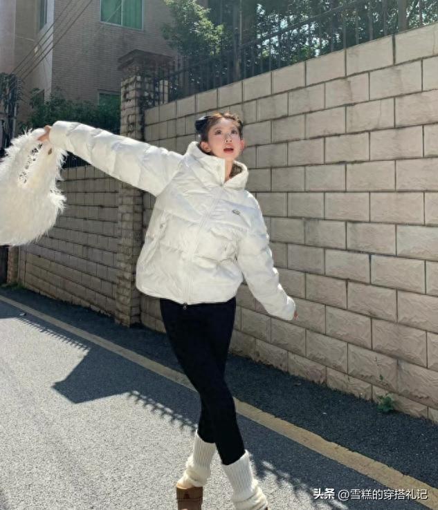 上短下長線條比例的設計,讓小個子女生穿搭也不喫虧,比較適合組合的有直筒闊腿褲或者拖地褲,大輪廓的穿搭可以平衡短款羽絨服的輪,造型的上下比例就很勻稱。