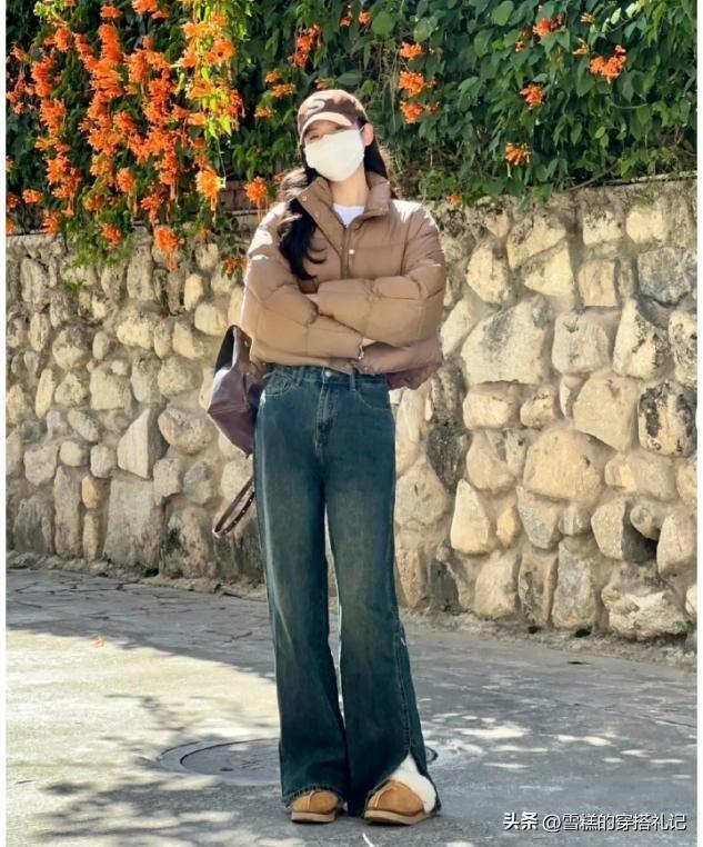 短款羽絨服的穿法很適配長褲,如果你能夠注意劃分自己的腰線位置,把高腰線條放置在肚臍以上的位置,就可以很從容的拉長腿型的視覺佔比,穿平底鞋也是很顯高的。