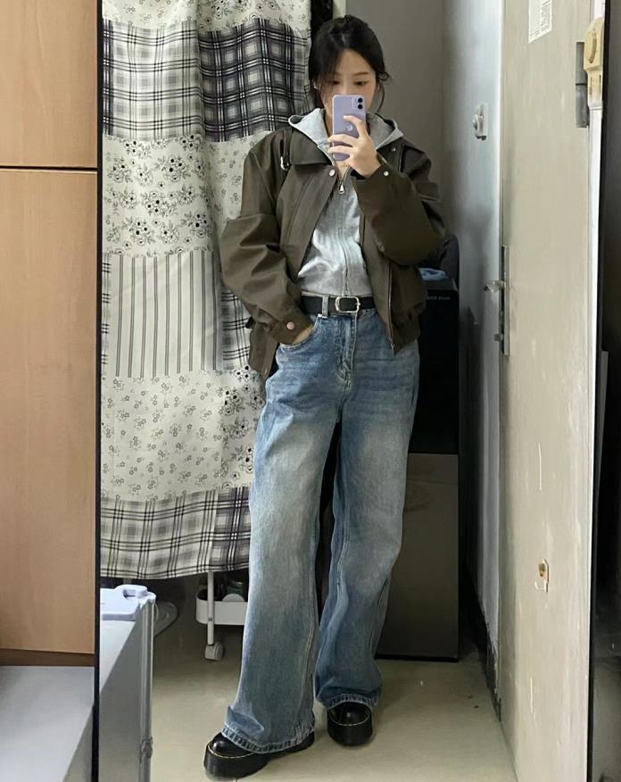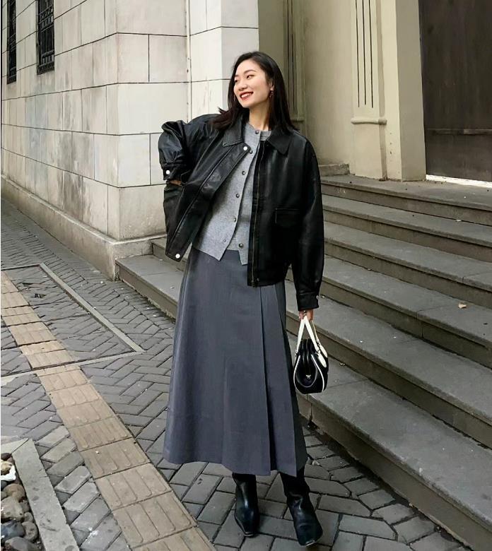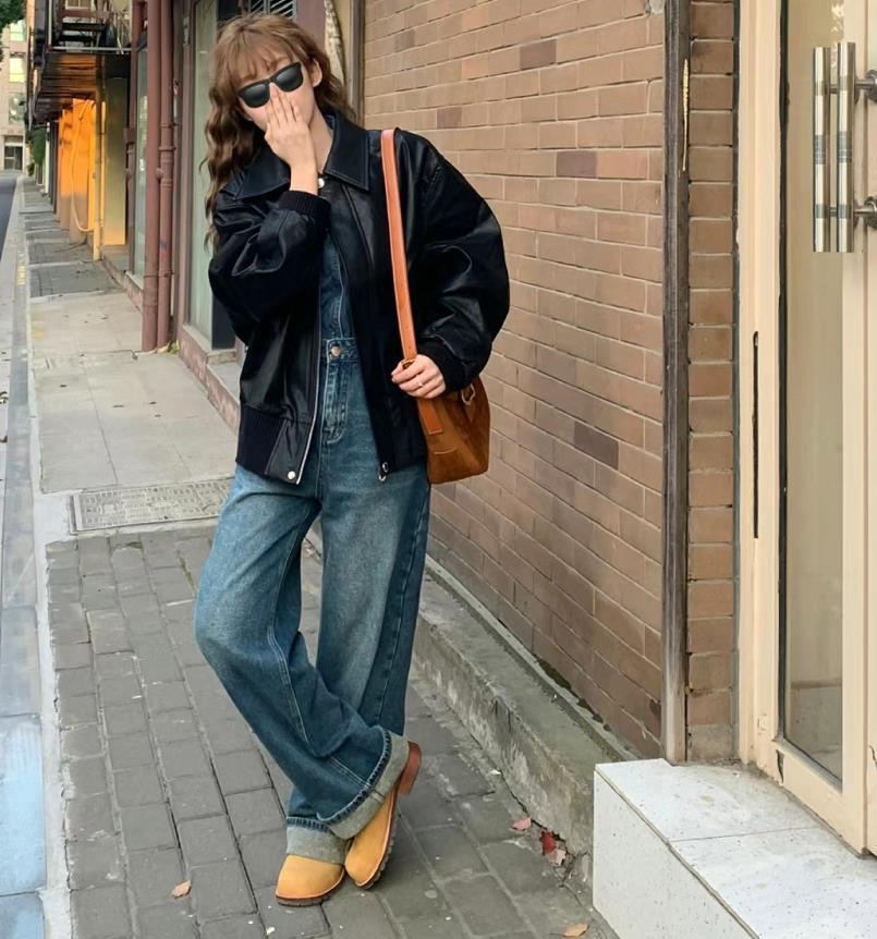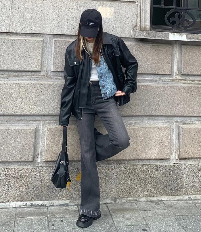 講真,皮衣疊穿牛仔外套是真的有被帥到,而且,這件黑色皮衣的材質很軟,上身後也超有型的。搭配一條微喇牛仔褲,既有些顯酷帥又很氣質。