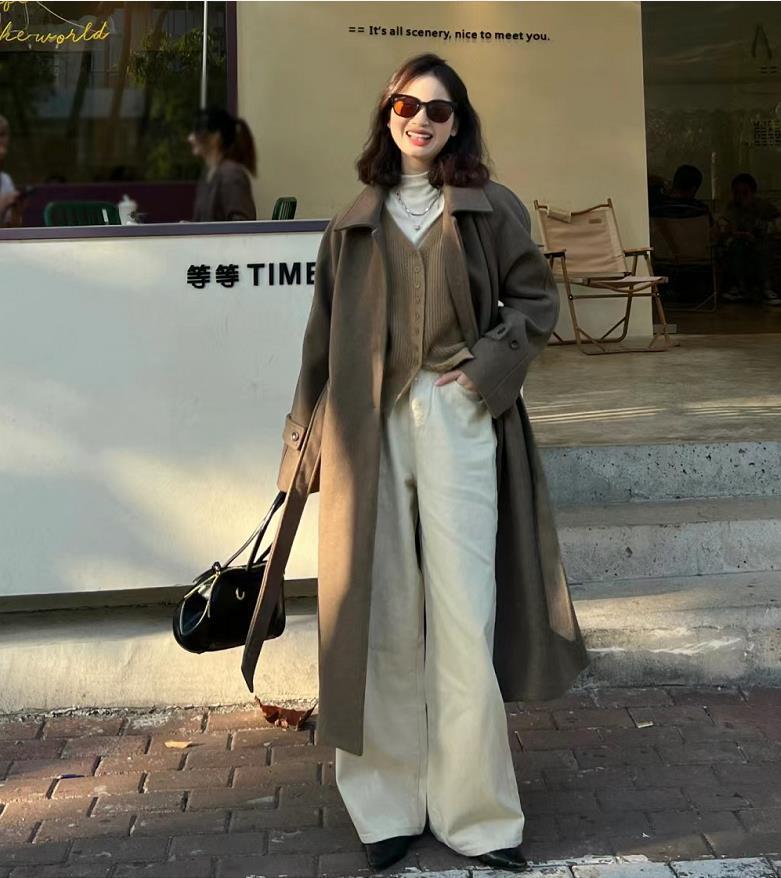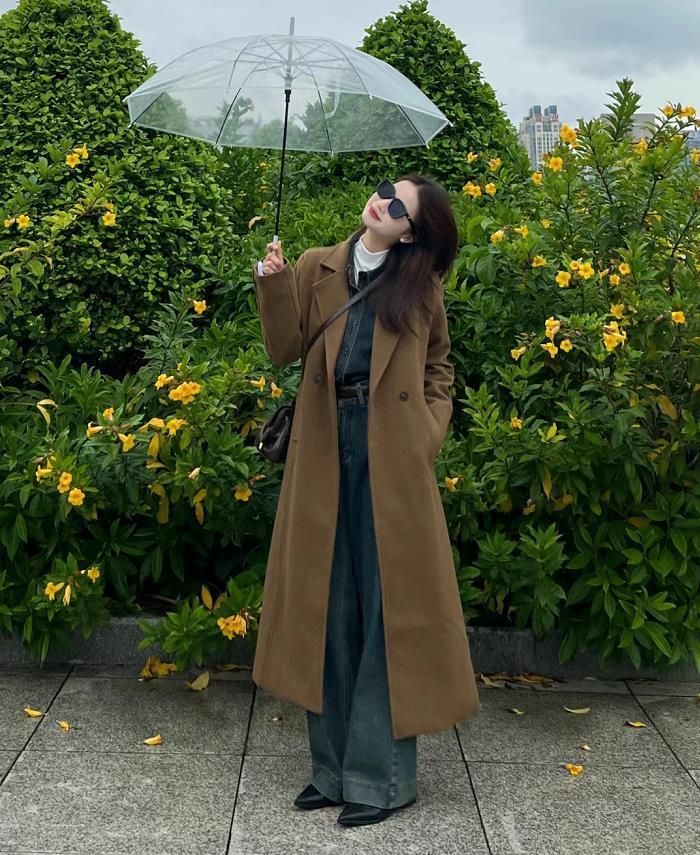 棕色的長大衣真的是很適合秋冬,這個顏色穿起來氛圍感直接拉滿,裏面疊穿了一件牛仔外套,就連下身也是一條牛仔闊腿褲,這麼一整體套裝,很省心又不出錯。