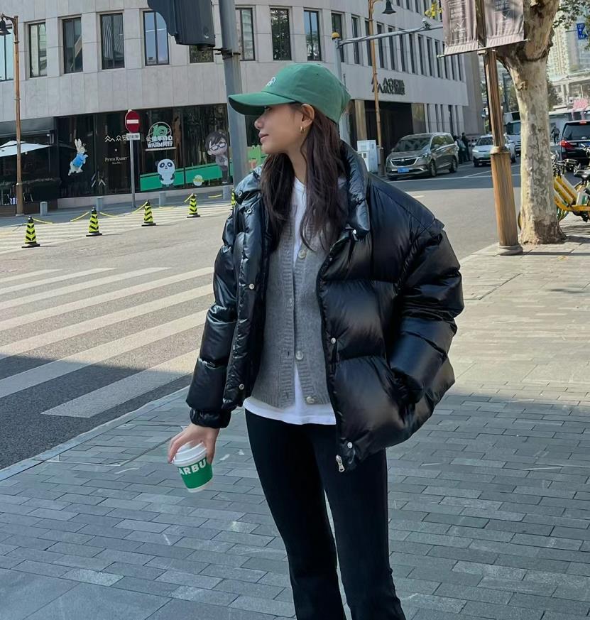 黑色羽絨服+灰色針織開衫,一厚一薄的疊穿,看起來就不會顯臃腫,更何況還把羽絨服敞開穿,下身也選了條緊身黑色褲,視覺上瞧着就十分顯瘦。