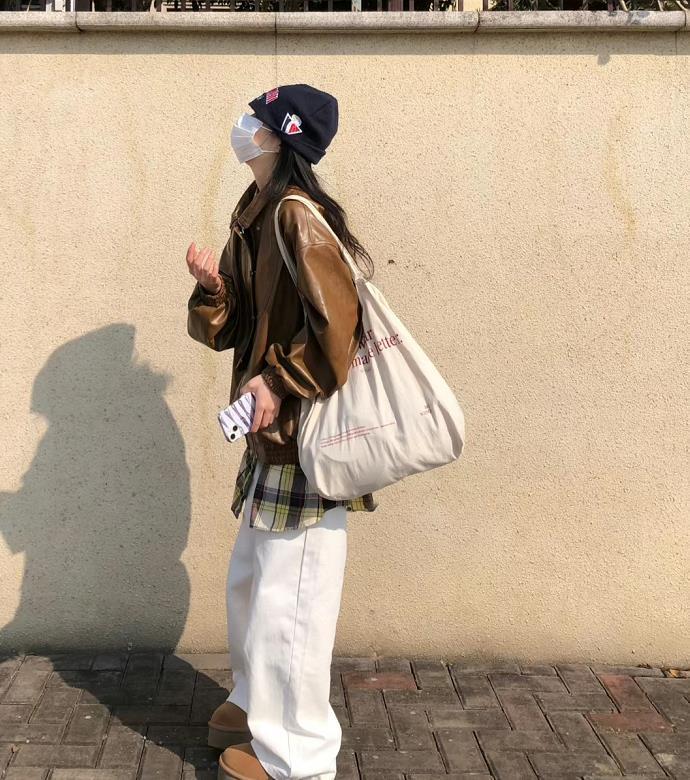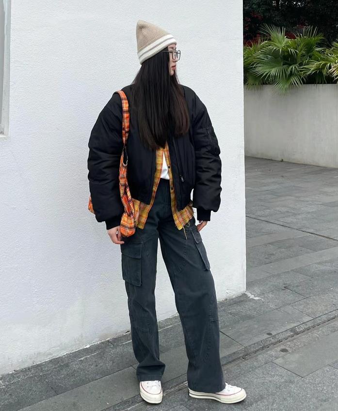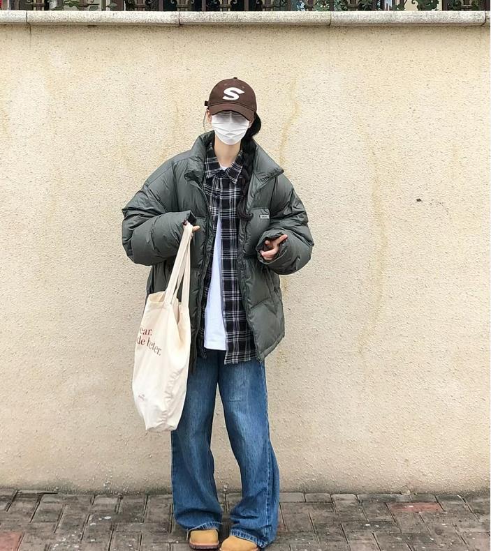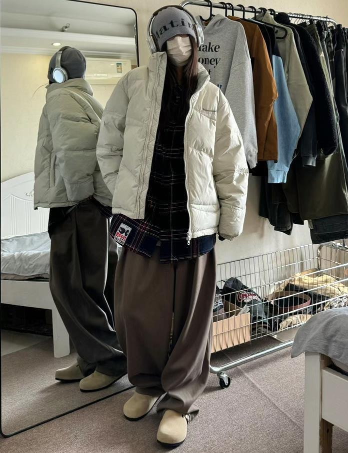 奶白色羽絨服+格紋襯衫外套+闊腿褲,比較顯鬆弛的穿法,休閒隨性又帶着些日系範。