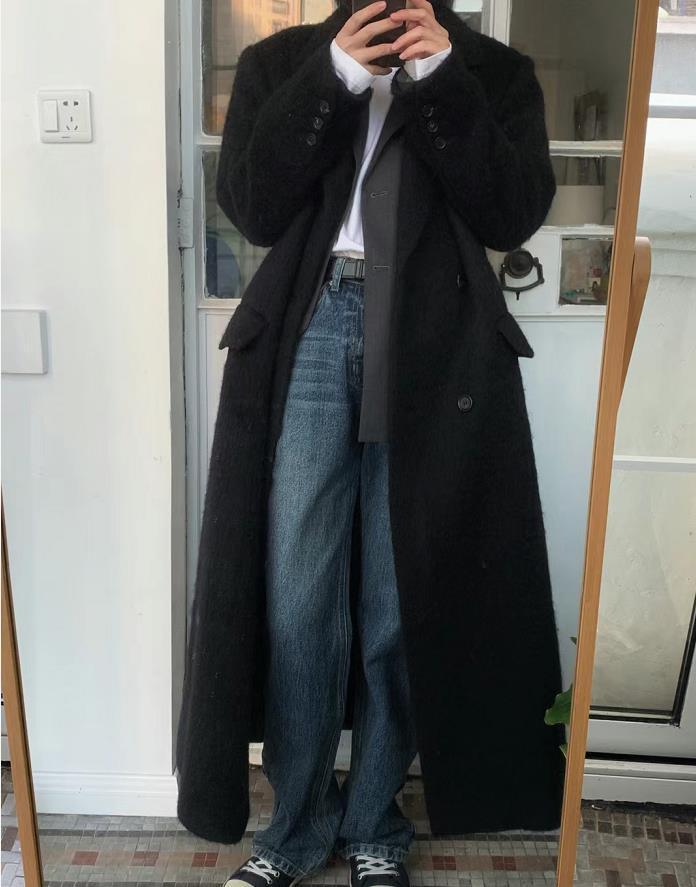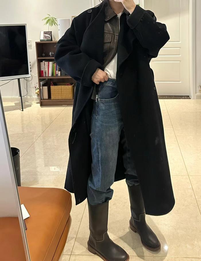 黑色長大衣+薄西裝外套,外套+外套的疊穿,真的是很時髦啊,保暖又不失層次。下身選擇一條牛仔褲,整體看起來就非常減齡休閒。