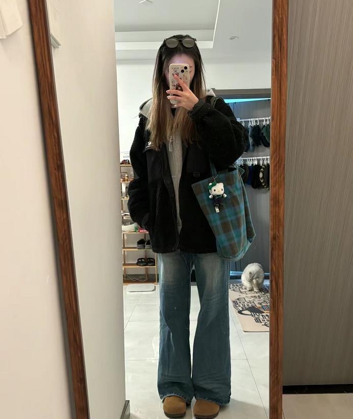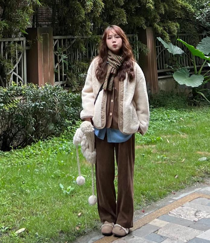 很保暖不露腿的穿搭,羊羔絨外套+牛仔襯衫外套,下身是一條棕色長褲,整體的配色有些美拉德風那味。休閒且隨性。