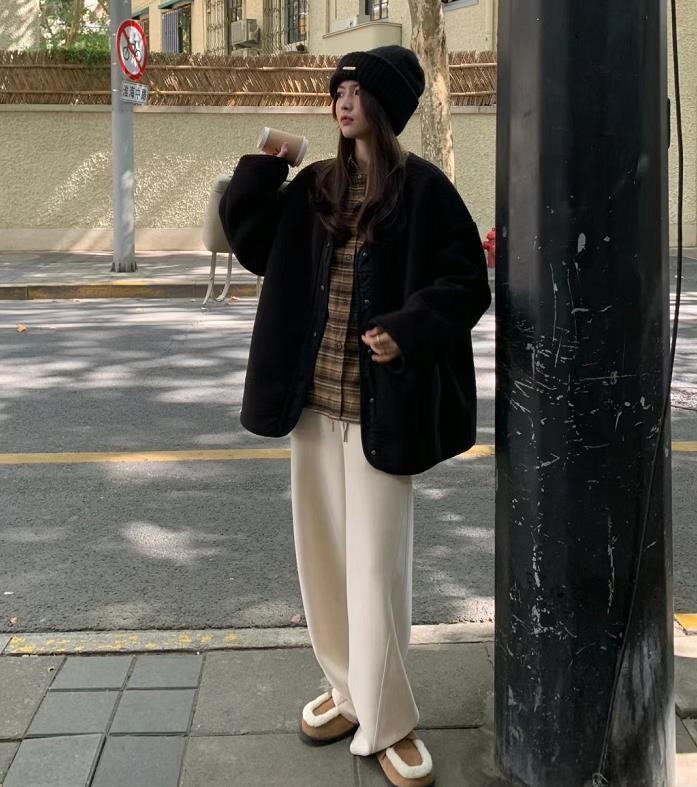 答應我,在這個冬天一定要嘗試下羊羔絨外套,軟軟糯糯的,很柔軟舒服,真的很難不愛啊。黑色羊羔絨外套+美拉德格子襯衫外套,一簡一繁的組合,十分顯層次。