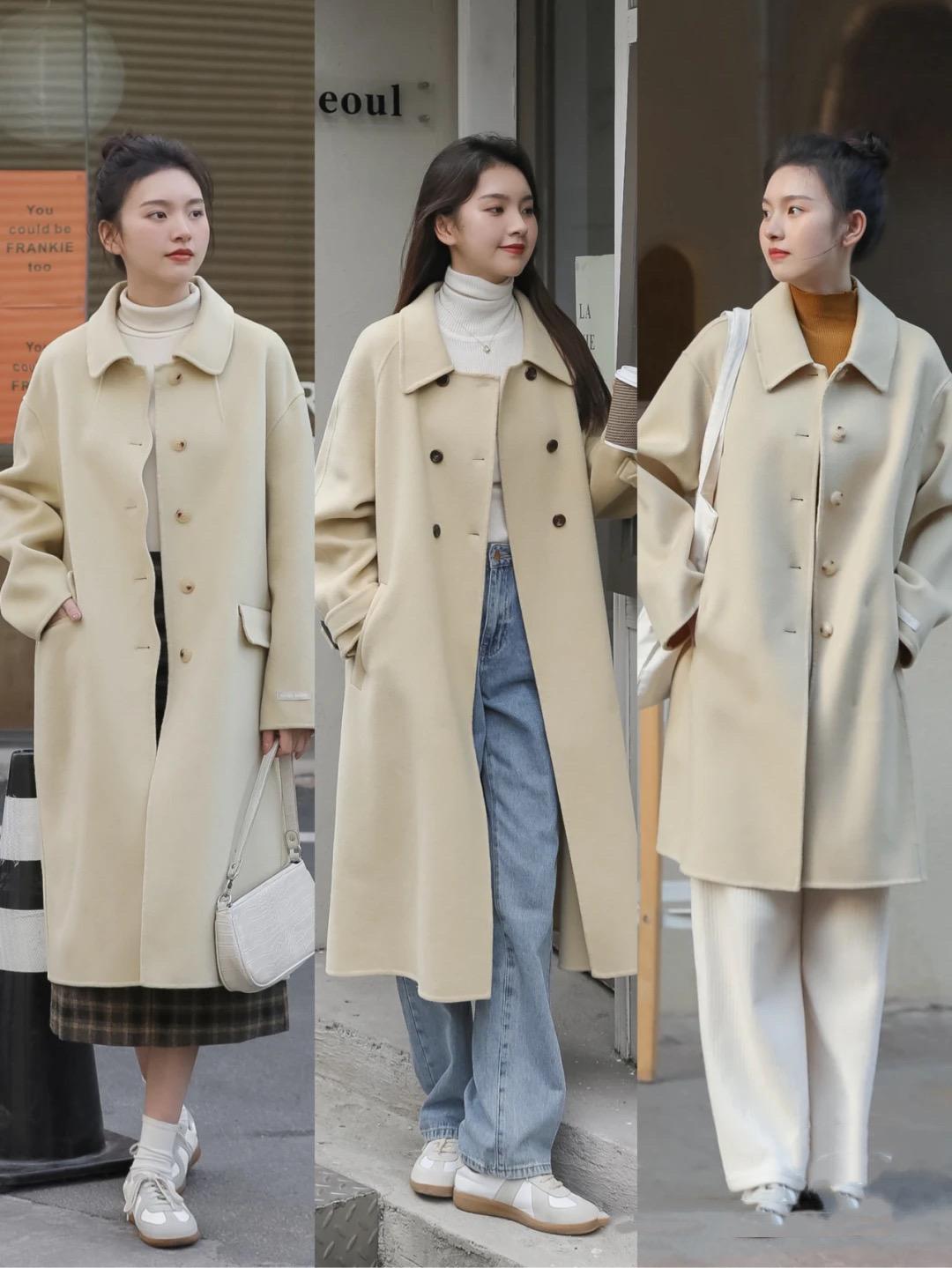 簡單的H型大衣,我們可以配厚實的毛呢面料。毛呢質地的大衣,軟糯且保暖。配高腰的白色毛呢闊腿褲,溫柔大方又有力量。