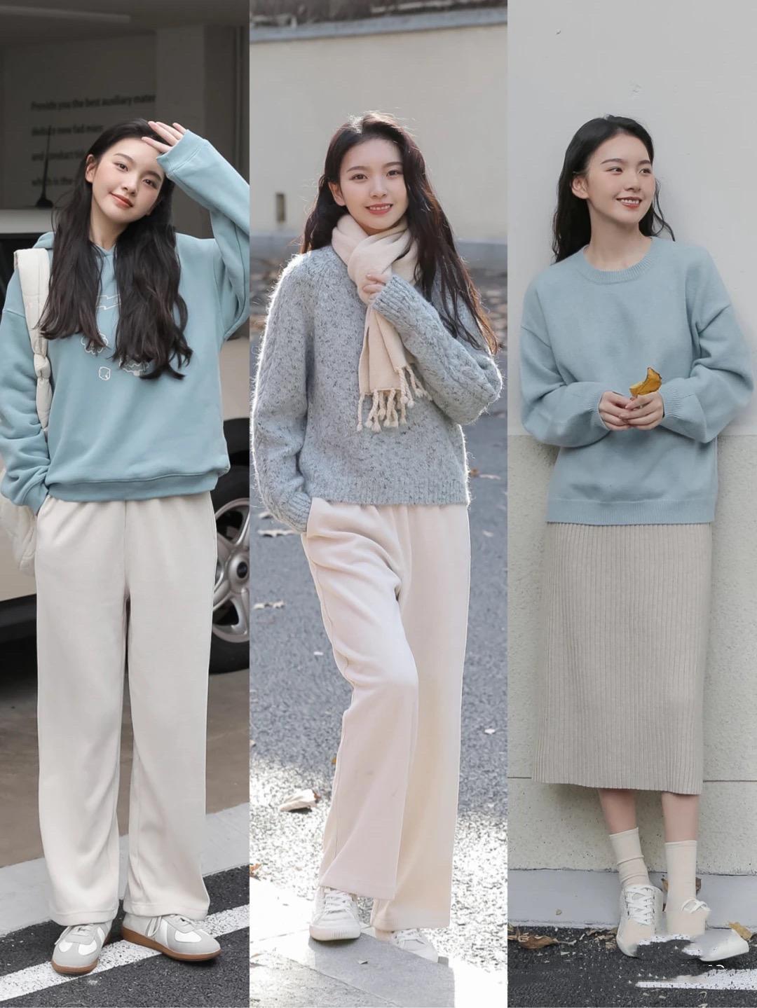 淺藍色的毛衣來搭配米白色的毛呢褲,給人一種更加溫柔甜美的氣質。色彩飽和度非常低的淺藍色、穿起來也格外的柔和嫺靜。