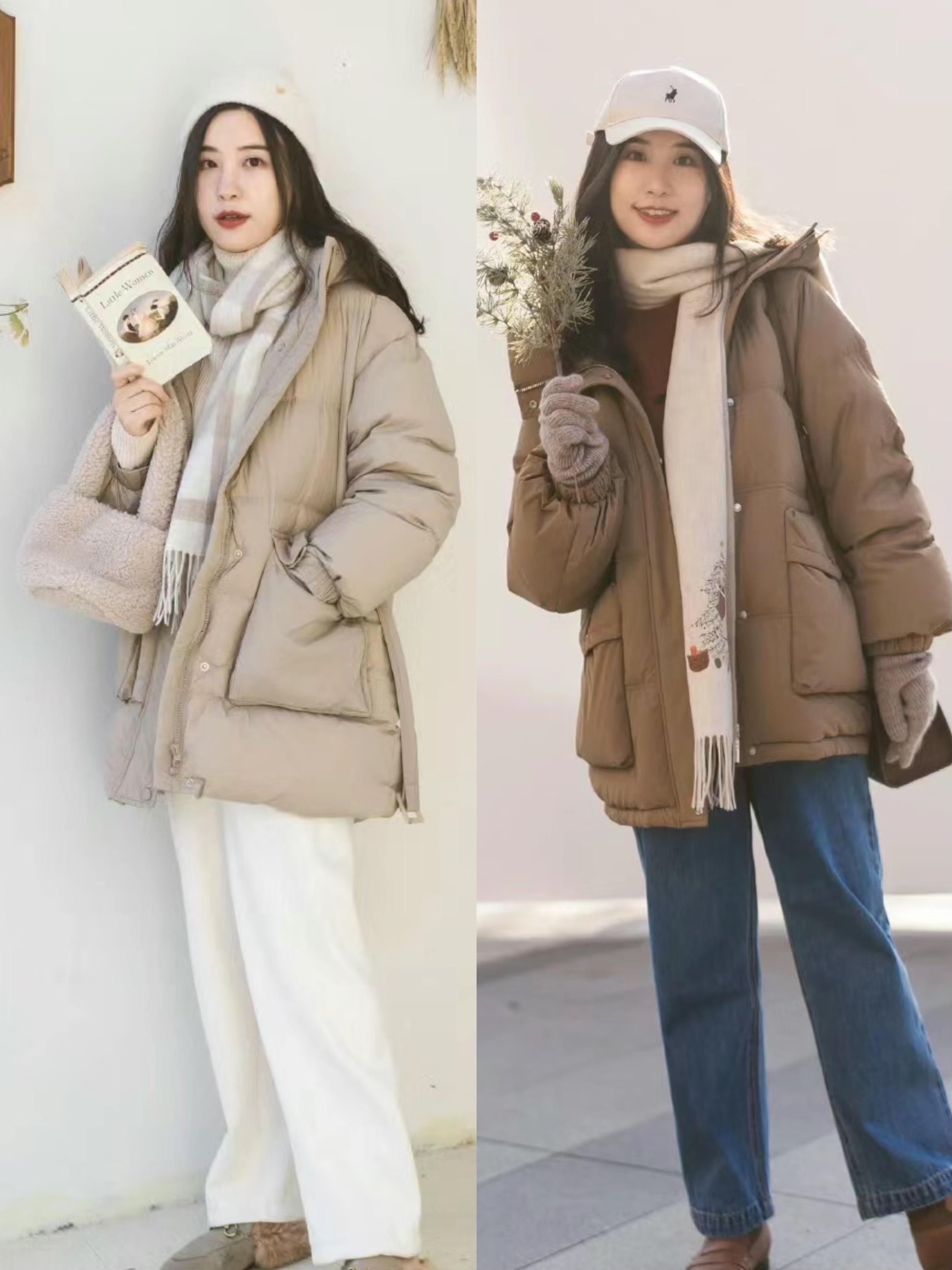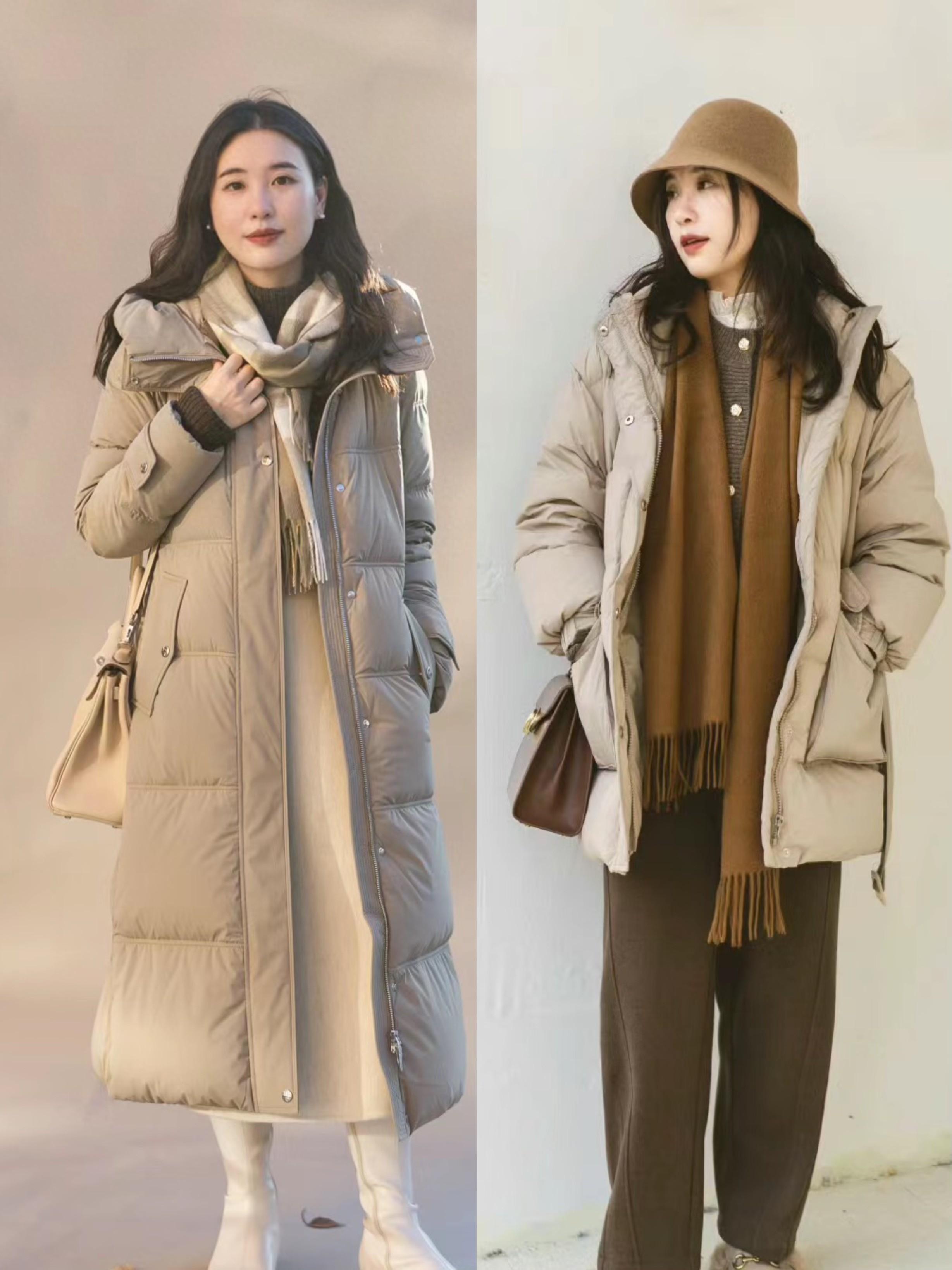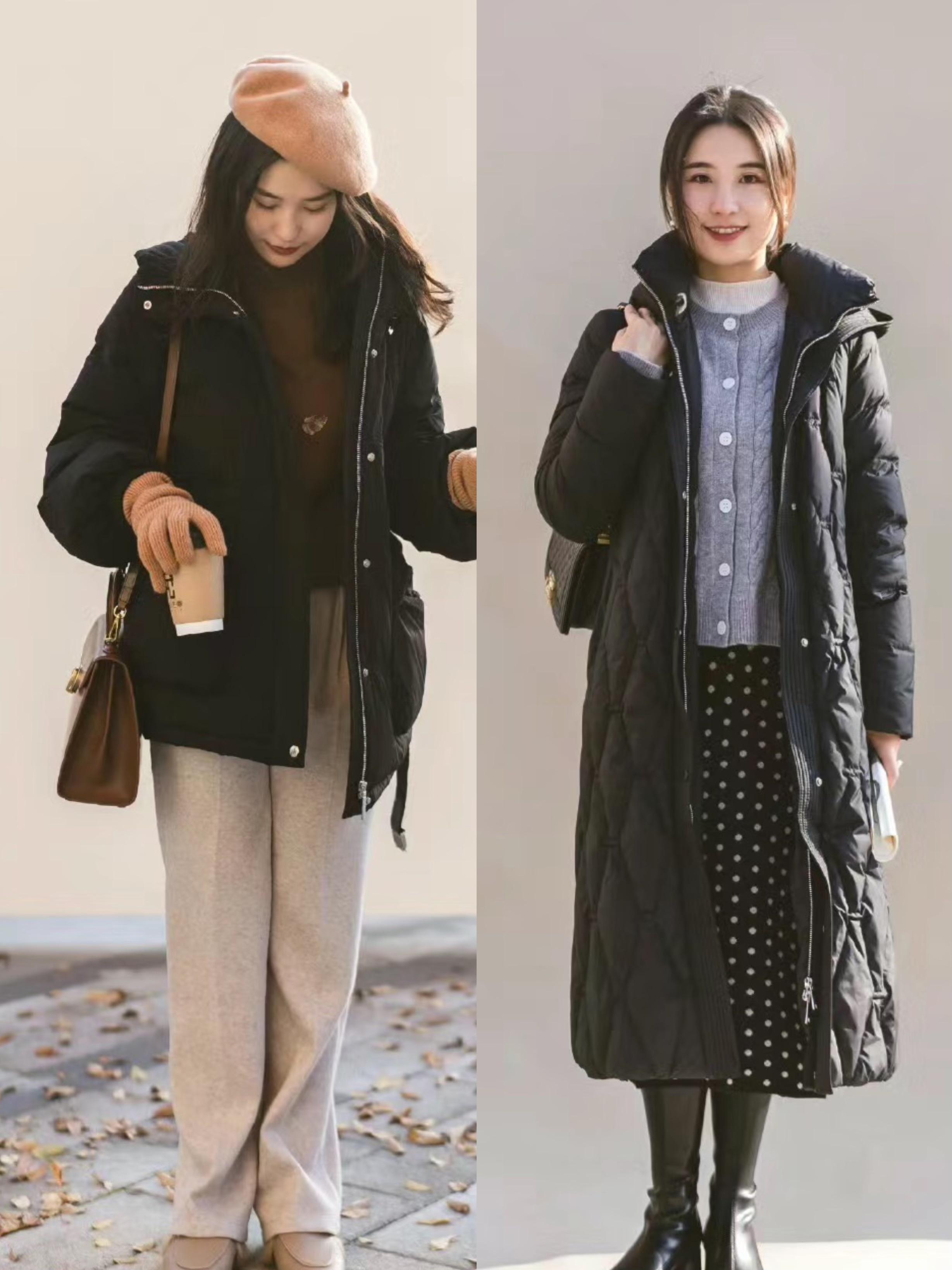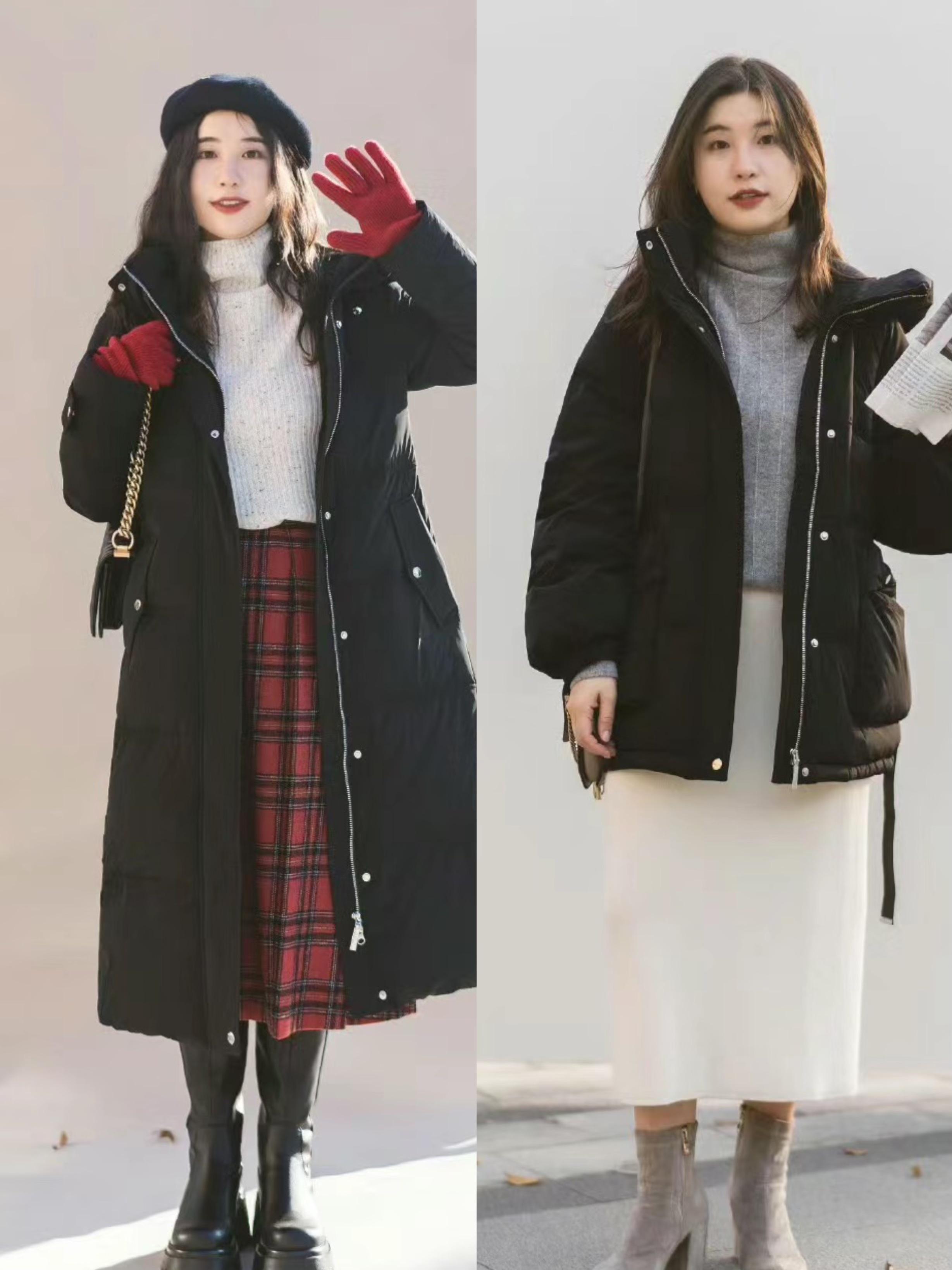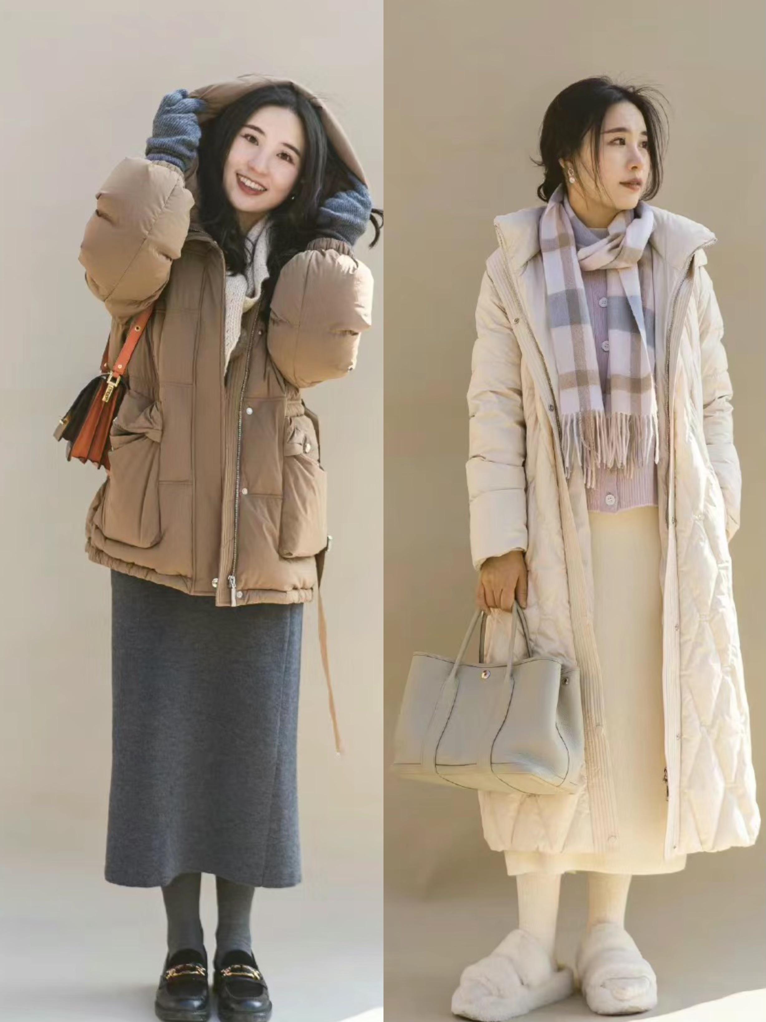不管是長款的羽絨服,還是短款的羽絨服,都不建議直接搭配打底褲來穿着。我們可以配一條厚實防風的毛呢半身裙,不僅更加雅緻、防風性也會更強一些。