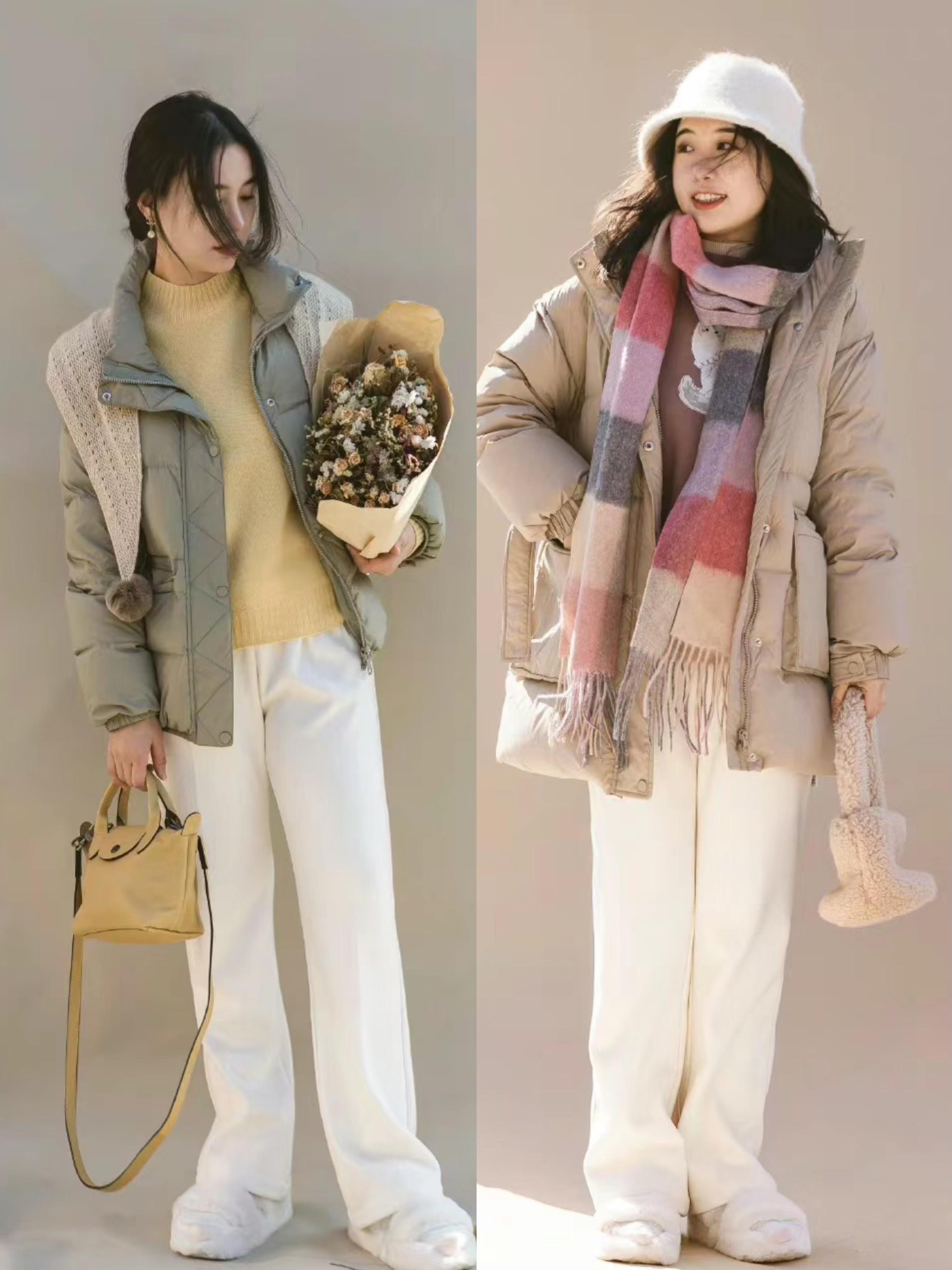 白色直筒褲,給人一種耳目一新的感覺。不管是米白色還是純白色的直筒褲,穿起來都更加溫柔大方。配過腰長度的羽絨服,也可以自然顯腿長。