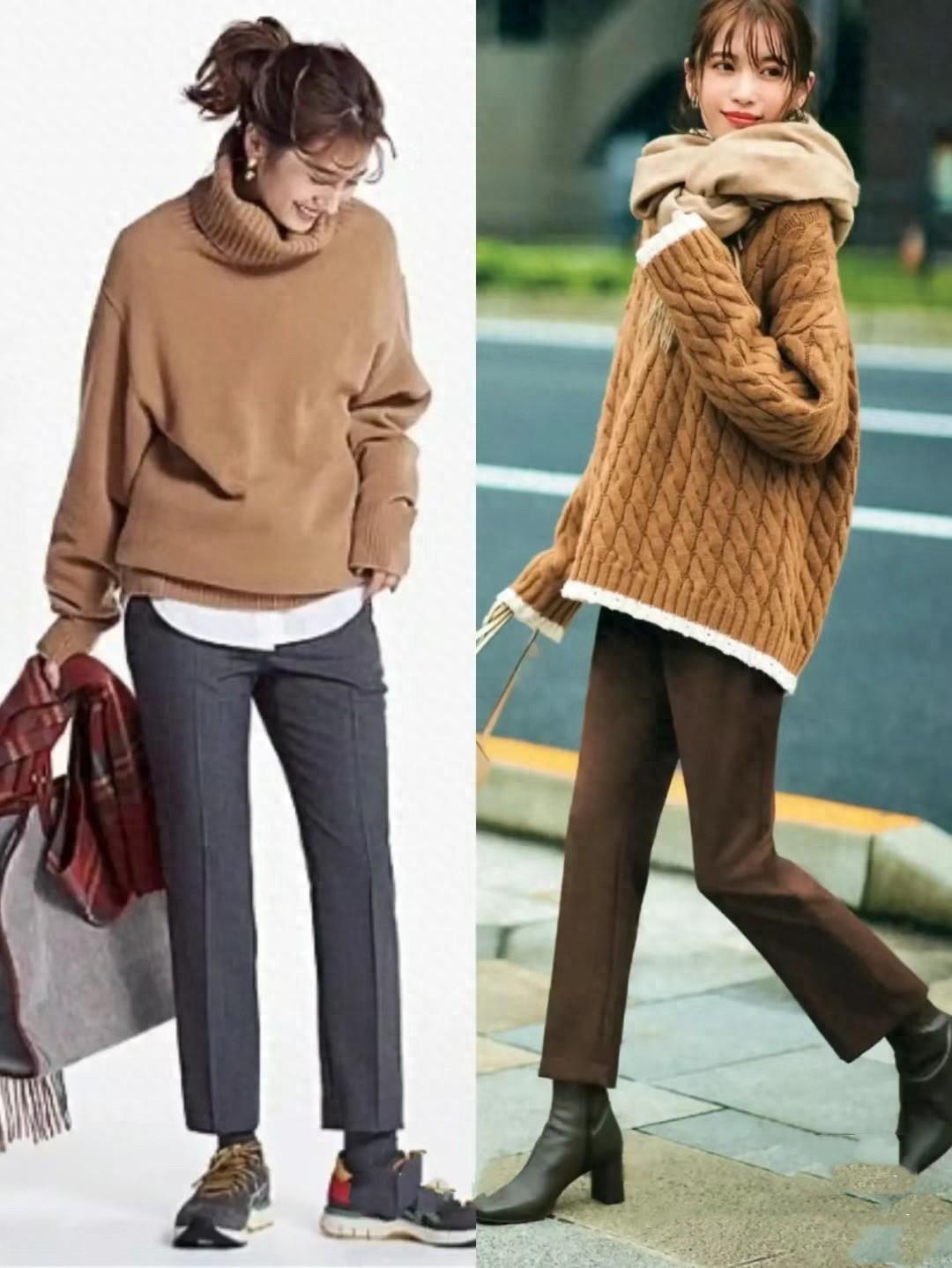 比如焦糖色的毛衣,可以搭配棕色系的高腰半身裙,就連短靴都選擇了復古耐看的焦糖色,這種整體暖色系的穿搭,就更加溫柔耐看、也凸顯出氣質美。