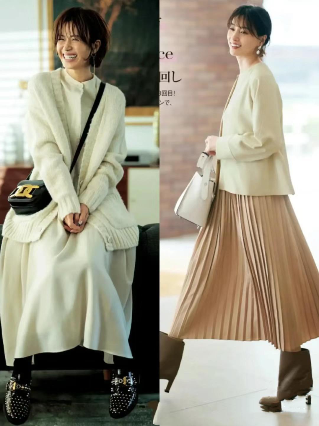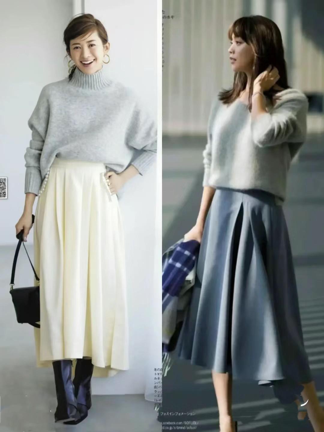 毛衣+半身裙的組合,是溫柔的也是雅緻的,想要更顯氣質一點、我們可以選擇純色淨版的毛衣,搭配同色系、質感高級的半身裙。