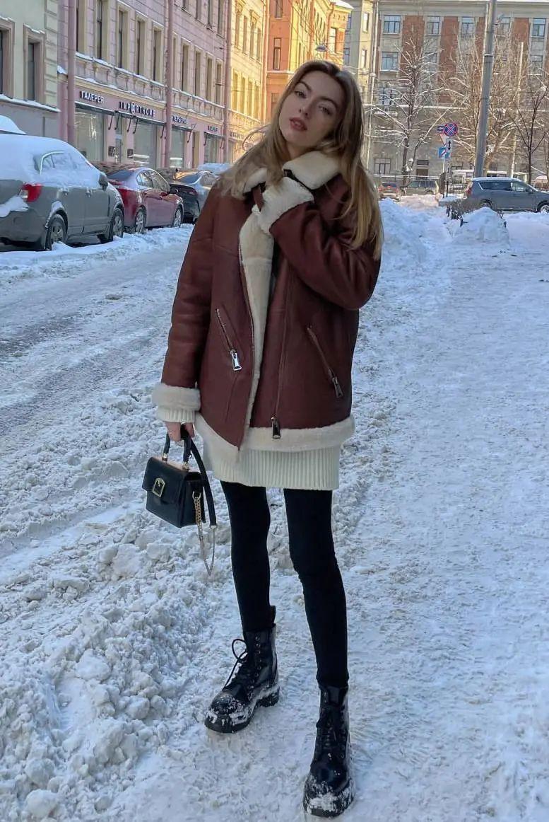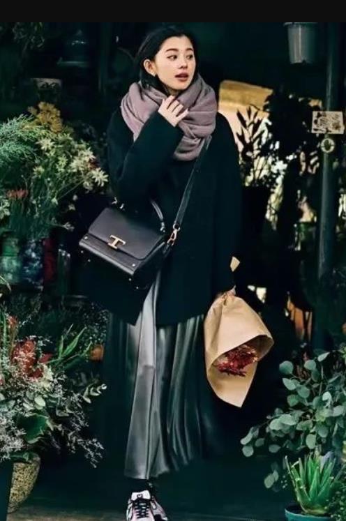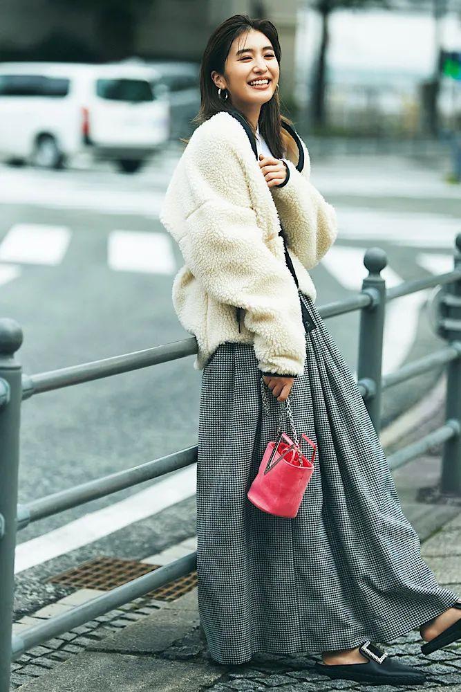 長款的羊羔毛外套+裙子,既保證了溫度又不失風度,可以展現出不一樣的風情與魅力。記得裙子的長度要遮過大腿粗的位置,這樣整體看起來就不會顯胖了。