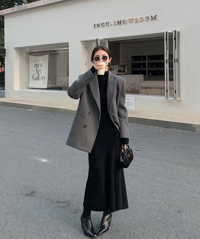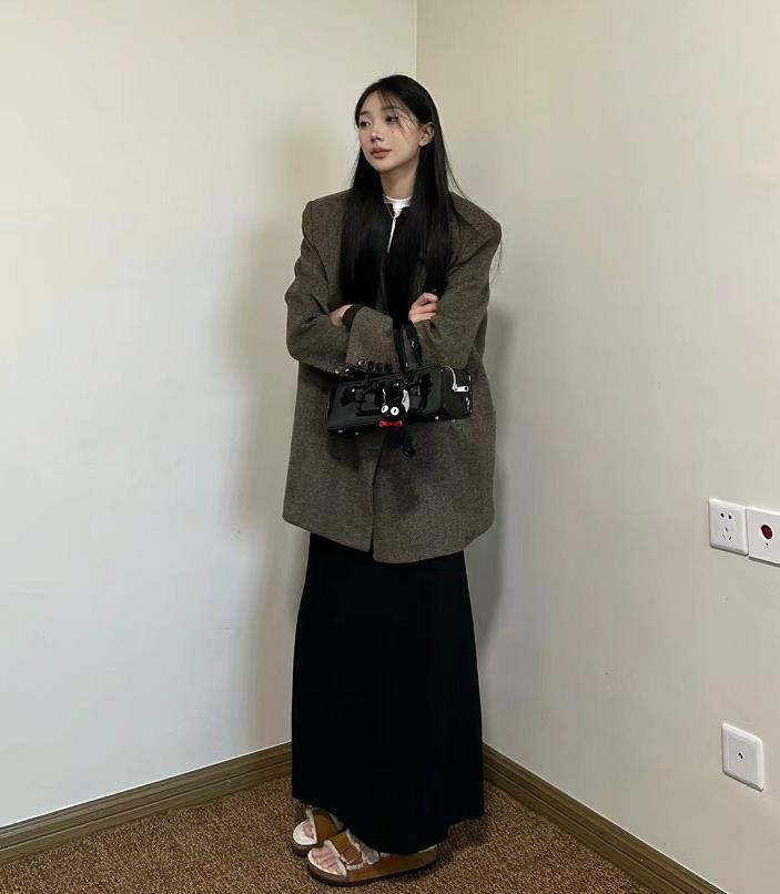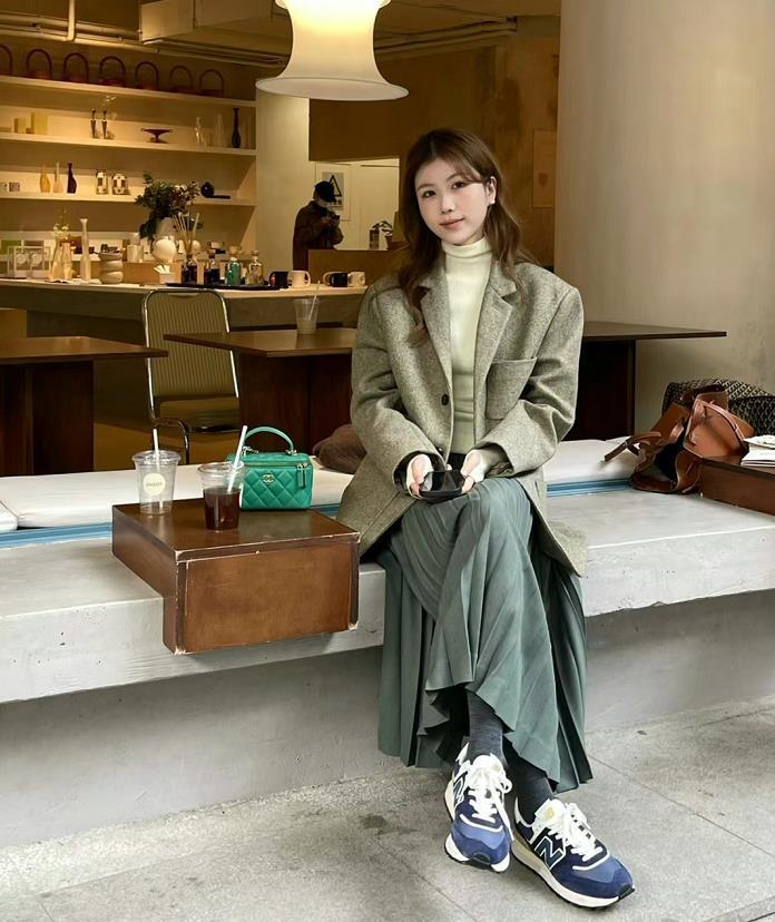西裝搭配長裙也太有氛圍感了,這樣的搭配看起來頗有韓系風格,西裝外套帶着一點墊肩,對溜肩很友好。