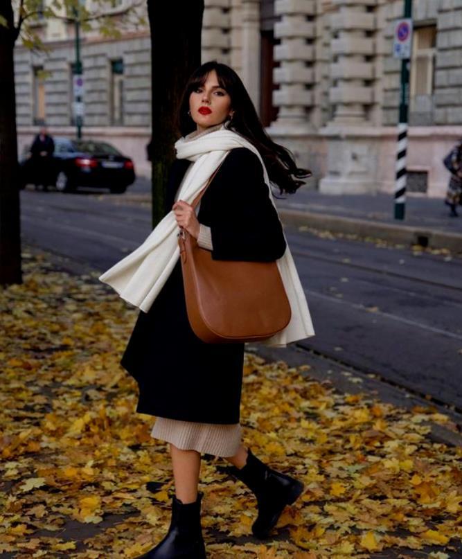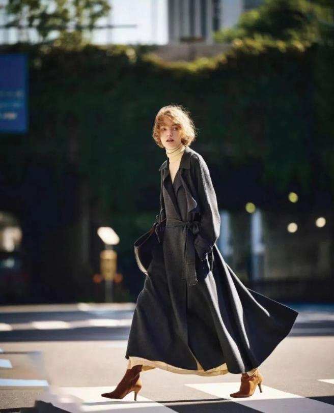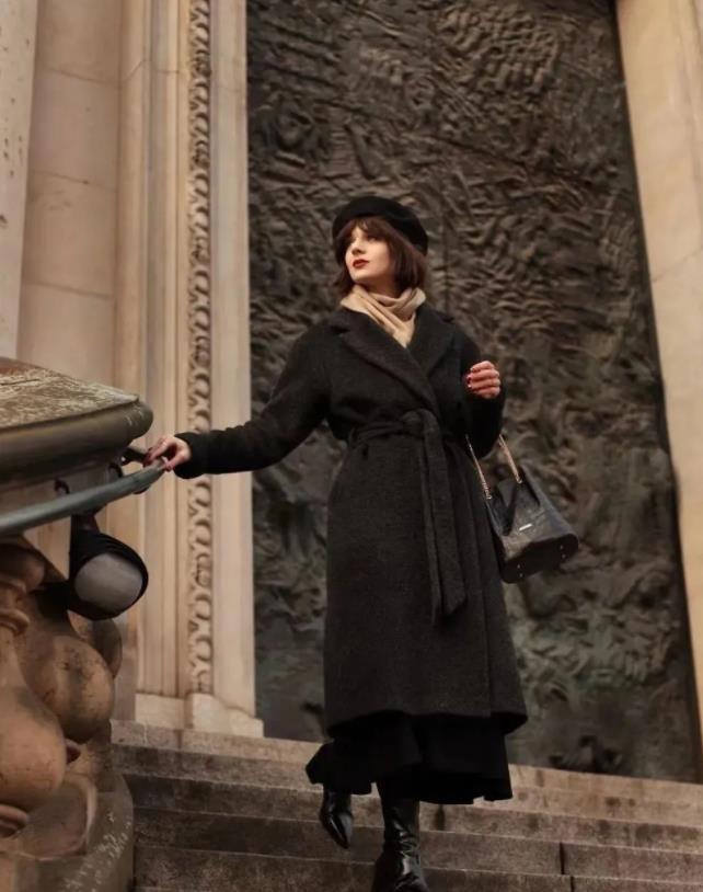 毛呢長外套+裙子,一厚一薄,層次感十足,既不失風度又有溫度,外套越松,裙子越緊的穿法,穿得更時髦好看。記得裙子的長度要比大衣長些,稍微露出10cm的裙襬,避免拖沓感。