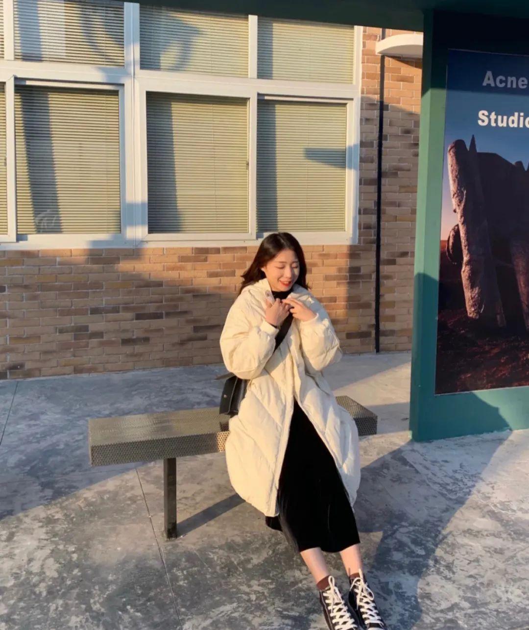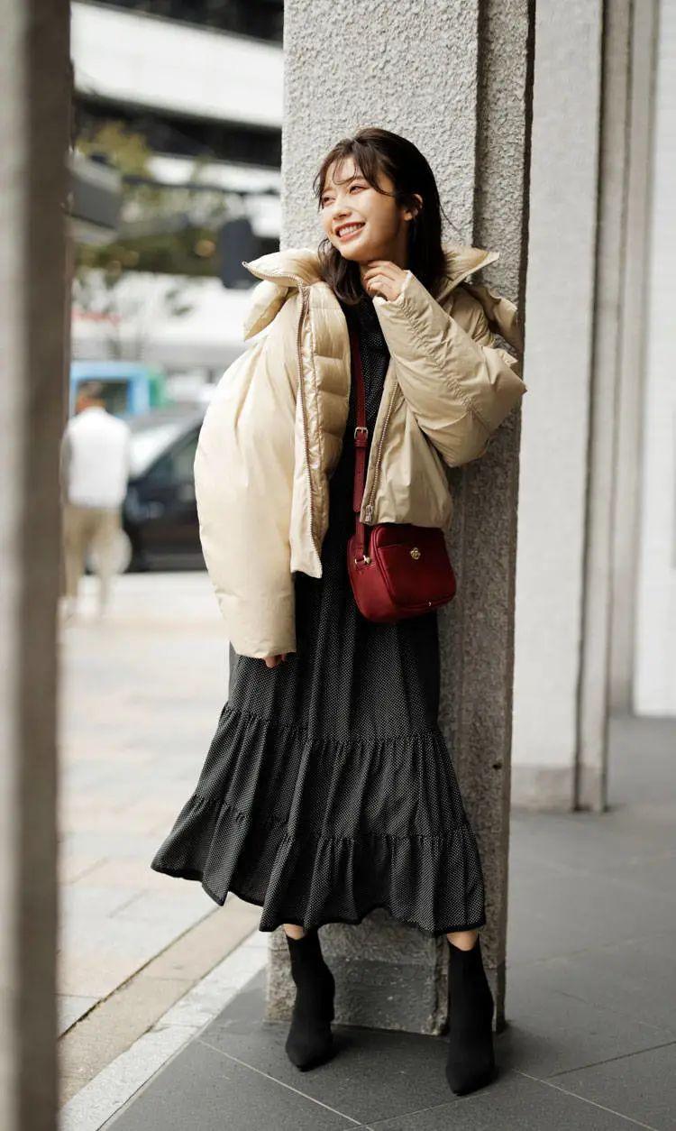 長款的羽絨服+裙子,這麼穿保暖效果會更加不錯,可以選擇同色系的組合,更顯高級。