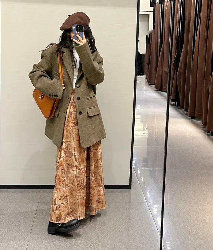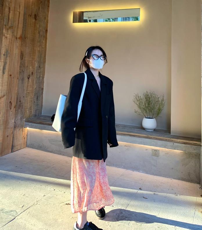寬鬆的西裝外套+印花半身長裙,一整個被溫柔住了,超顯氣質的。
