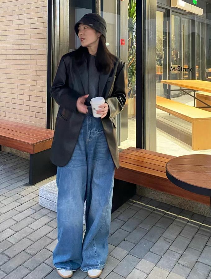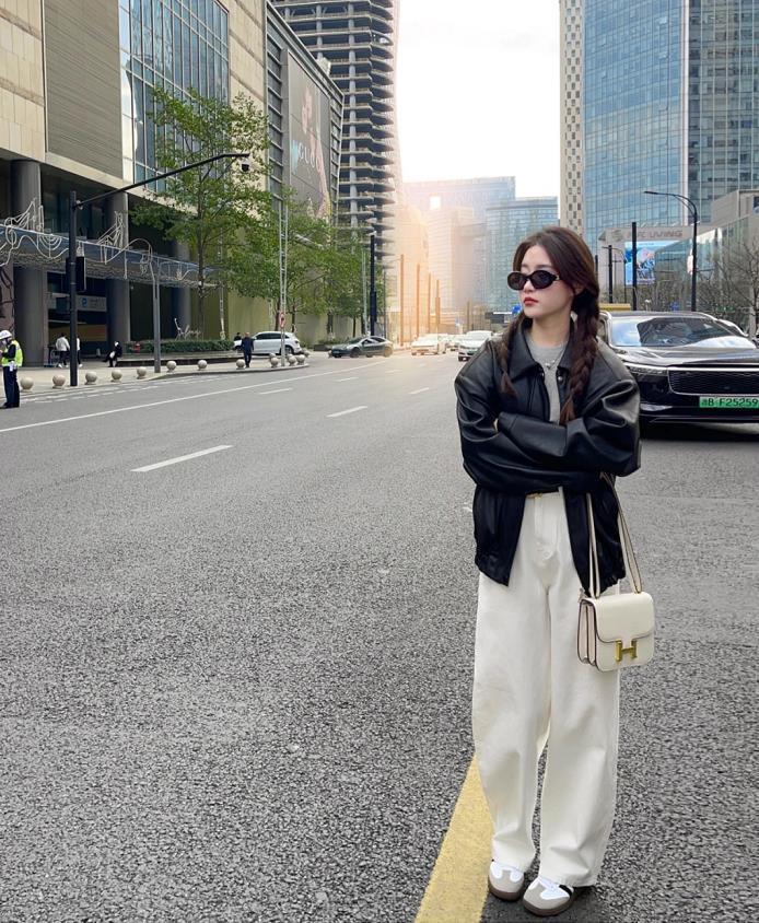 黑色皮衣外套+牛仔闊腿拖地褲+白色運動鞋,又酷又帥還顯隨性的範,寬鬆的褲子版型下,雙腿瞧着更顯瘦藏肉了。