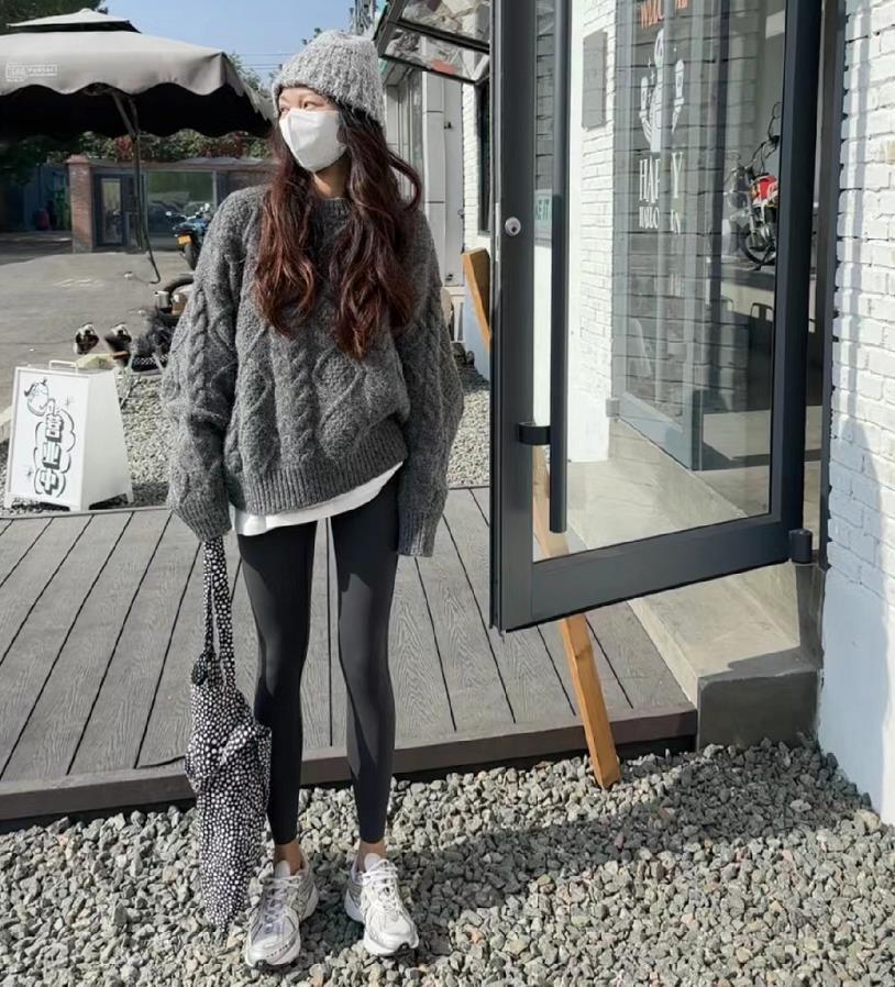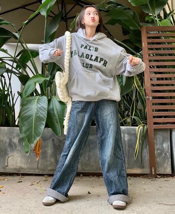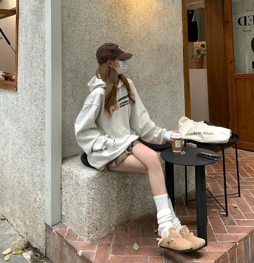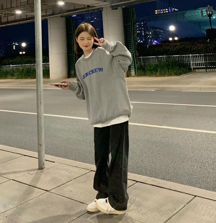 這一件灰色的連帽衛衣,真的是顏值和舒適並存,簡簡單單搭配牛仔闊腿褲,很有學生感又很韓。鞋子是運動鞋,爲造型增加了休閒感,日常生活上班或逛街都可以這麼穿。