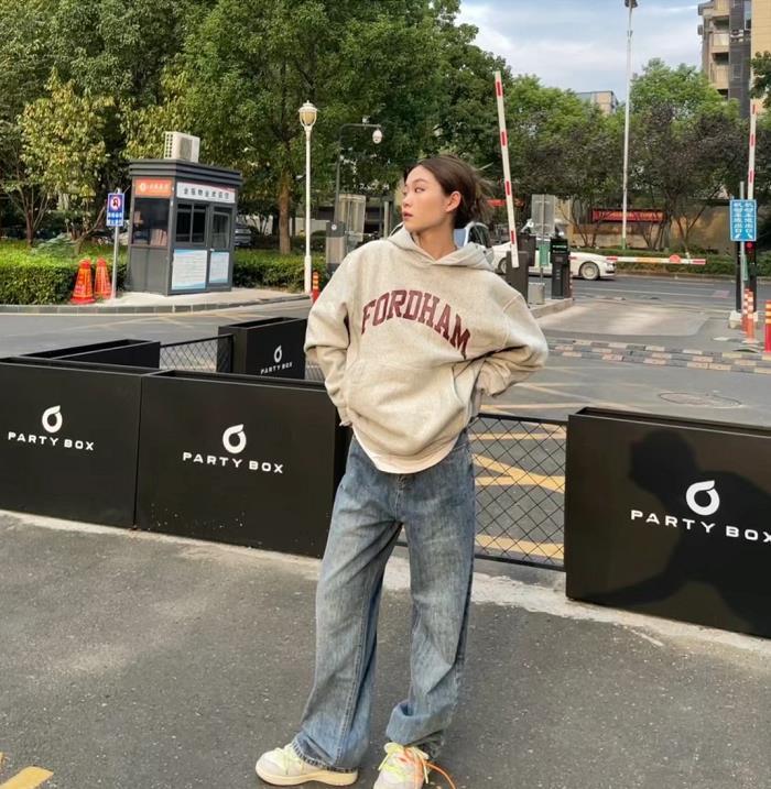 花灰色連帽衛衣+直筒牛仔褲,休閒舒適又不失青春感,字母設計的衛衣,還是挺潮的,裏面疊穿一件白色t恤,不失層次又保暖。