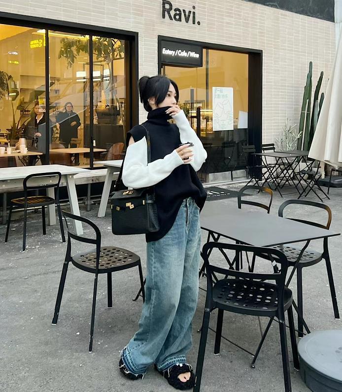 拖地褲可是打造鬆弛感穿搭的必備單品啊,黑白拼色的露肩毛衣,很顯個性時髦,又牛仔拖地褲相配,回頭率挺高的。