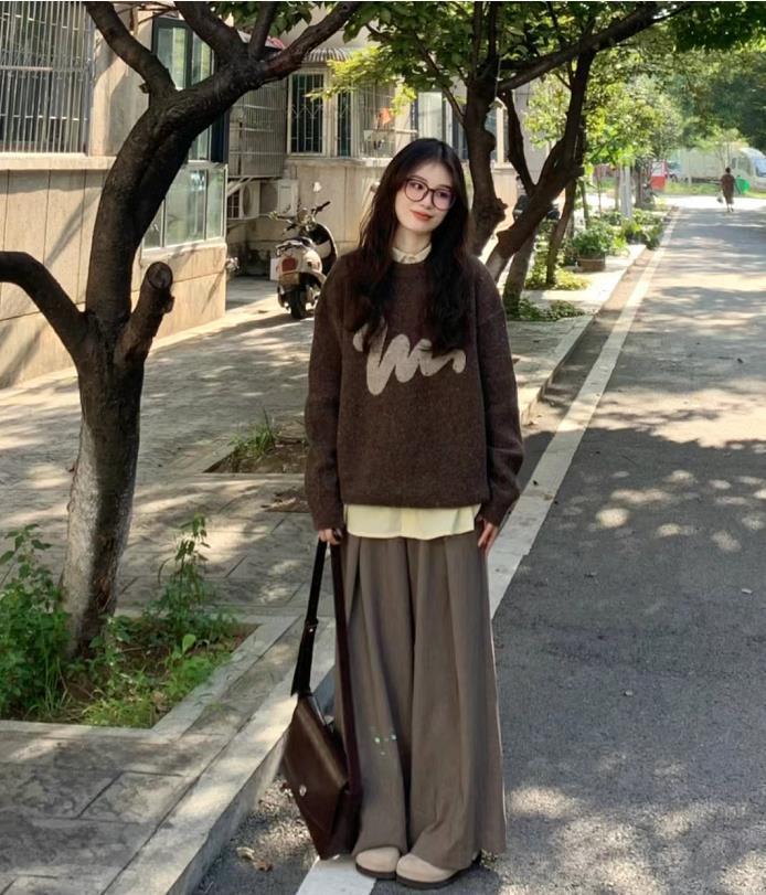 挺顯韓系復古的一套,瞧着就很不錯呢,棕色的毛衣,裏面疊穿了一件襯衫,記得要將襯衫的領子和下襬露出一點,這樣才更顯層次。