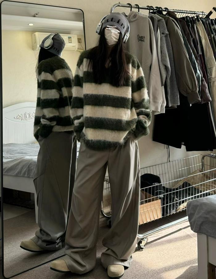 寬鬆版型的條紋毛衣+復古拖地褲,慵懶味好濃啊,真的很喜歡這種垂墜感極佳,又帶點拖地長度的褲子,可不要覺得壓個子,反而是很顯高挑和顯腿長。