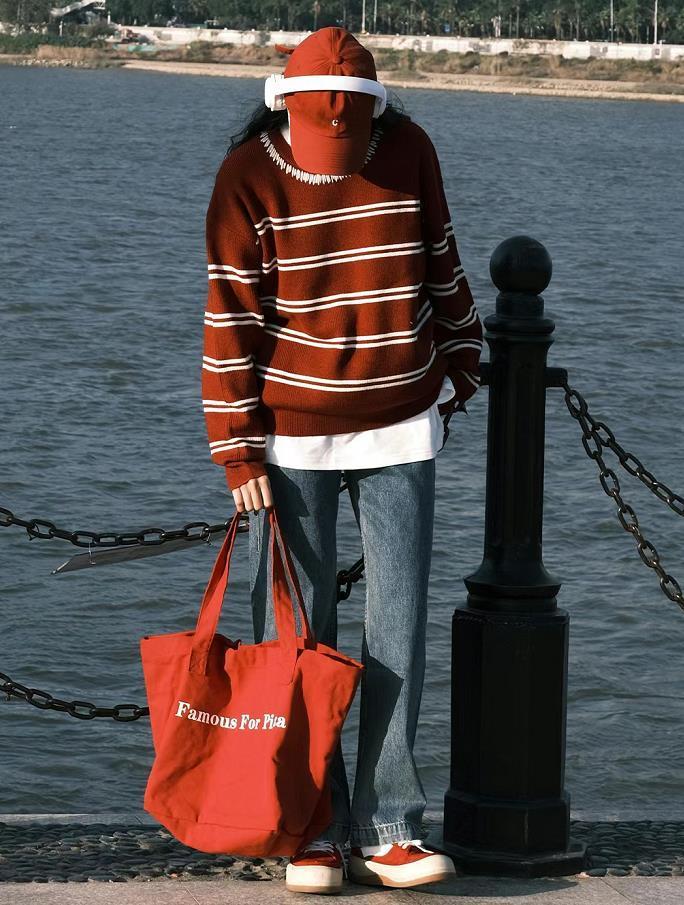 很顯美式的復古穿搭,這一套可以直接將秋冬氛圍感給拉滿了呢!紅色條紋毛衣版型是寬鬆的,可以穿出時髦的鬆弛感,下身簡單配牛仔褲就很好看。