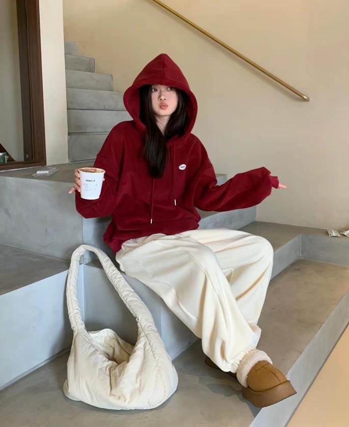 紅色連帽衛衣,穿起來整個人都很洋氣啊,休閒舒適的款,誰會不喜歡呢?選擇一條奶白色闊腿褲,裏面還是加絨的,保暖效果超好。
