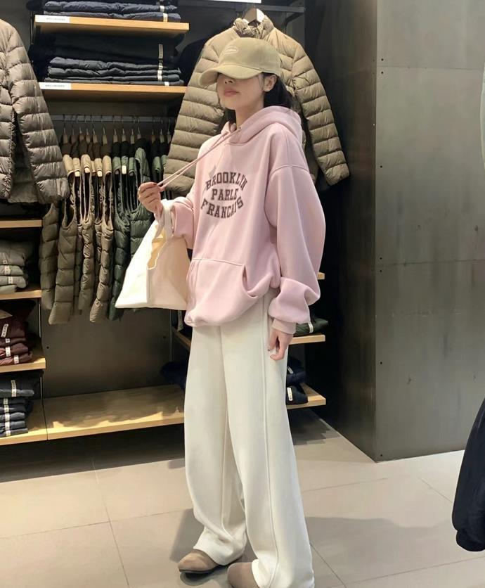 這個淺淺的粉色連帽衛衣,顏色好嫩啊,超正的色調,穿起來可顯白減齡了,與奶白色闊腿褲相配,粉+白的配色可好看了,鬆弛感滿滿的一套。