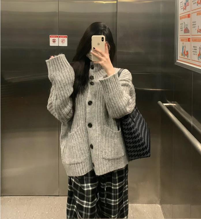 灰色針織開衫+黑白休閒格子褲,很喜歡這種舒服慵懶的感覺,上簡下繁的組合也非常顯層次。上下版型都是寬鬆的版型,搭配一起就很休閒。