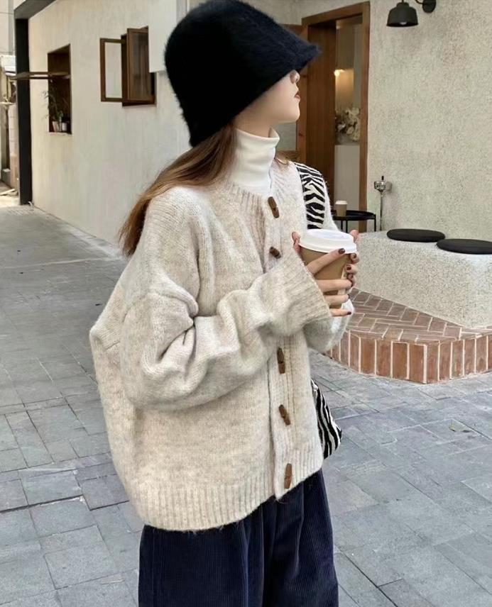 溫柔即美好,這一套穿搭看起來就非常休閒慵懶,淺色牛角釦針織開衫,寬鬆的版型,對身材的包容性也是極佳的。
