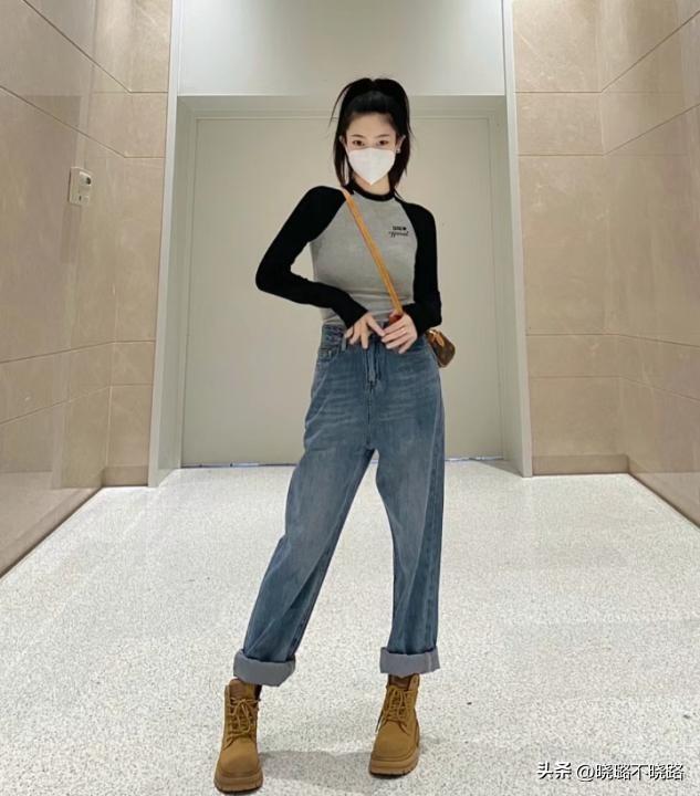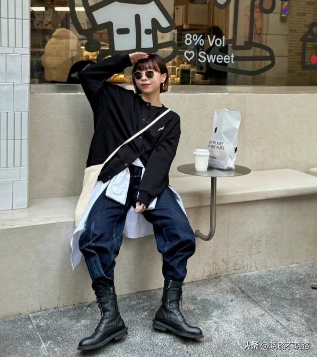 無論你的牛仔闊腿褲選擇的是什麼長度?再搭配短靴的時候,褲腳部分都可以形成一小截翻折的設計,如此來搭配短靴,優化了腿部延長的效果,整體造型更顯腿長,小個子女生很受益。