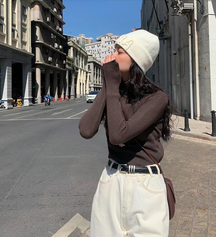 深咖色的高領毛衣,這個顏色真的很百搭耐看,穿起來更是襯膚色,與白色牛仔闊腿褲相配,超級好看的。白色針織帽子與褲裝顏色進行了呼應,和諧又高級。