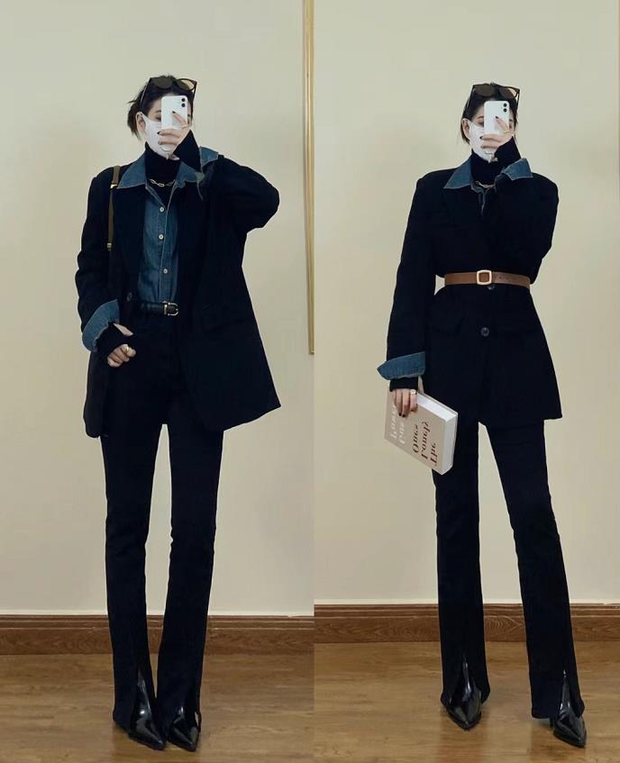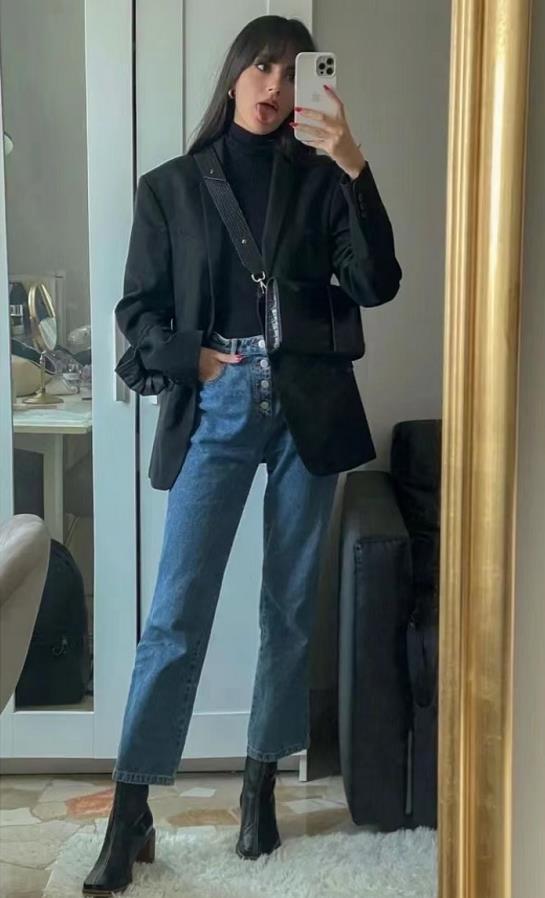 黑色高領毛衣與黑色西裝外套的組合,真的保暖又不失氣質,下裝配的是九分牛仔直筒褲,加上粗跟短靴後,雙腿的比例就瞬間被拉長了。