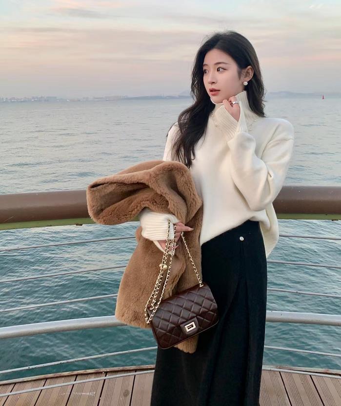 如果覺得修身的高領毛衣不喜歡,那麼就選擇寬鬆一些的版型吧,這樣穿起來才更顯瘦藏肉。南方的女生,秋冬直接單穿也很好看,搭配長裙,超美的。