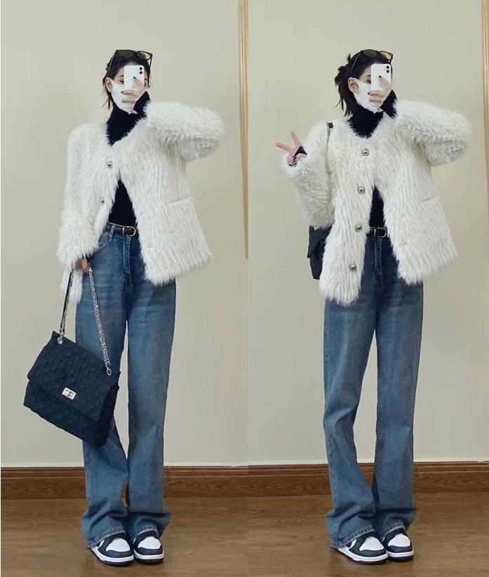 這種黑色高領毛衣作爲打底,是真的很友好啊,外面選了件白色毛絨絨外套,穿起來整個人都變得很暖和。搭配牛仔拖地長褲,拉長腿部線條又顯腿長。