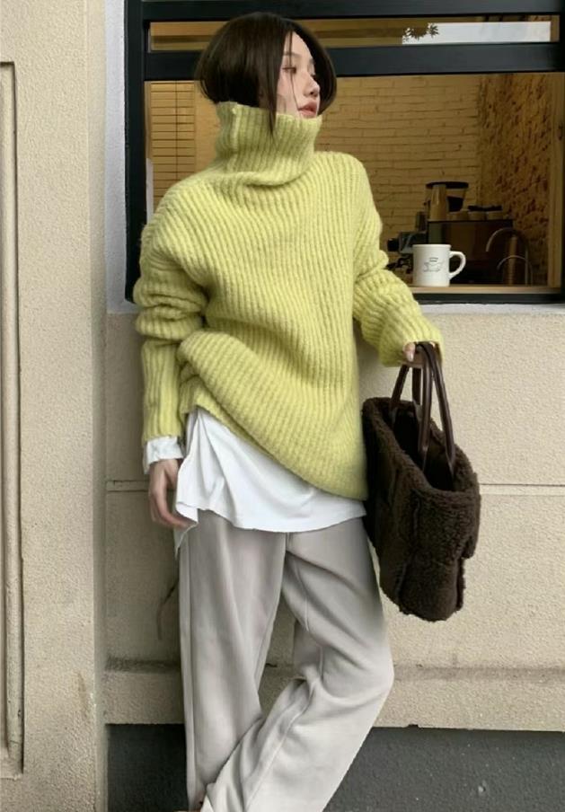 低飽和度的亮色高領寬鬆毛衣,穿起來可保暖了,適當的寬度,對身材也進行了修飾和遮掩。可以在裏面疊穿白色t恤,或者是外搭大衣等。