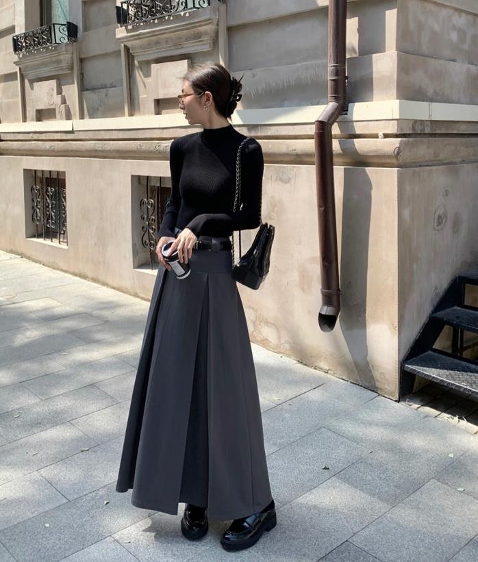 黑灰的配色組合,最顯高級了,黑色半高領毛衣,真的是打底單穿的最佳,修身的版型,上身後輕鬆勾勒出完美的身材比例。而灰色高腰百褶半身長裙,則爲整個穿搭增加了優雅氣質。