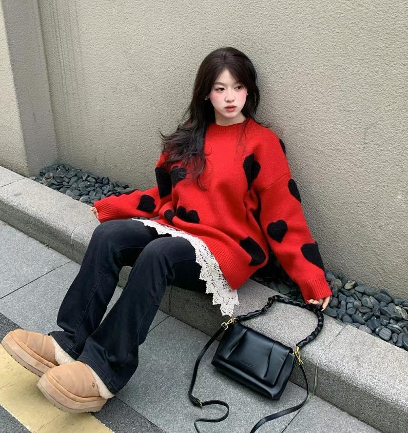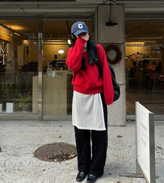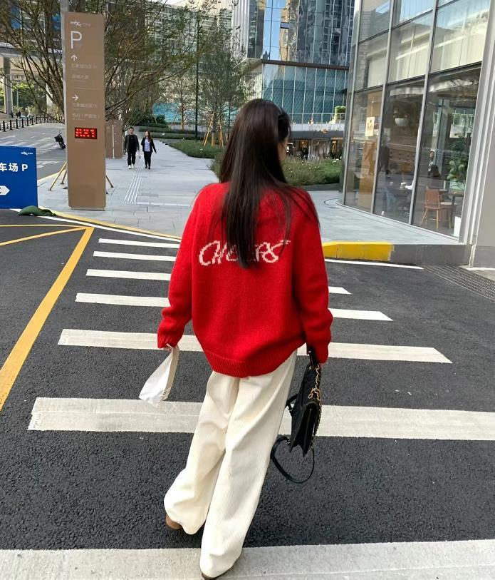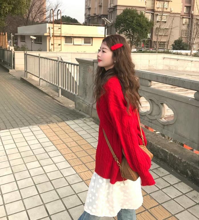 大過年的,說什麼也要爲自己準備一件紅色系的單品啊,紅色毛衣這麼一穿上,新年的氛圍感不就來了嗎。這種紅色基礎款毛衣,很好搭配衣服,也不挑人穿。