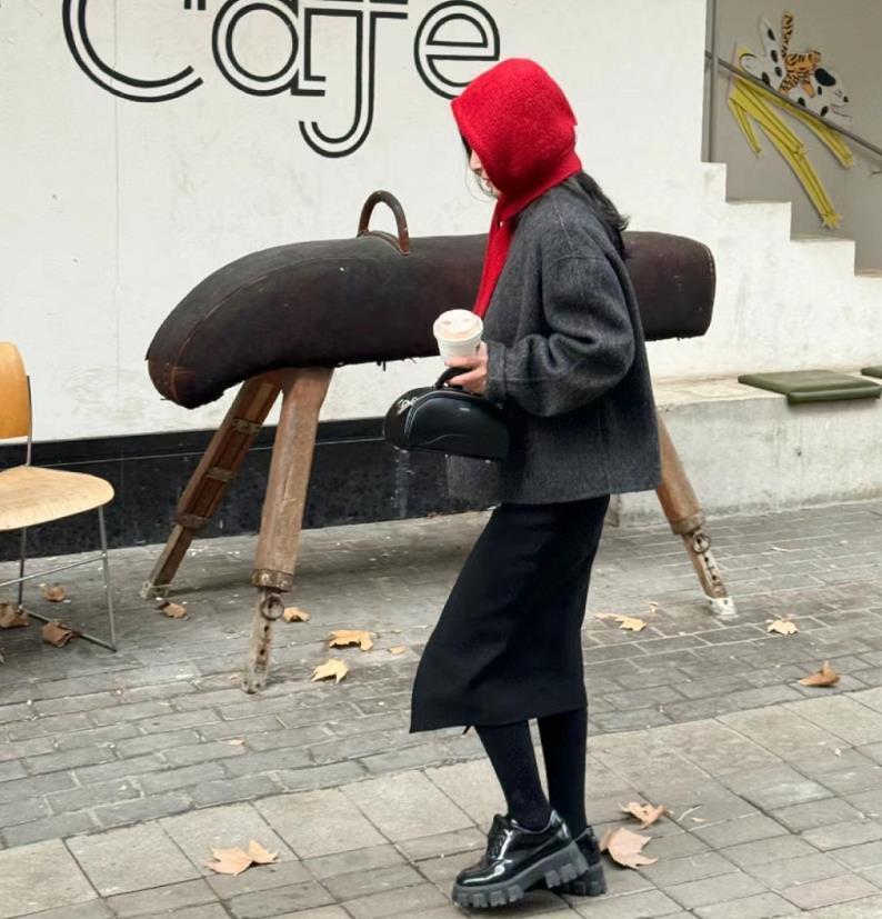 灰色裏點綴上衣一些紅,這個節日氛圍感就出現了,灰色外套+黑色半裙,紅色帽子包裹着,不僅保暖,還十分洋氣時髦。