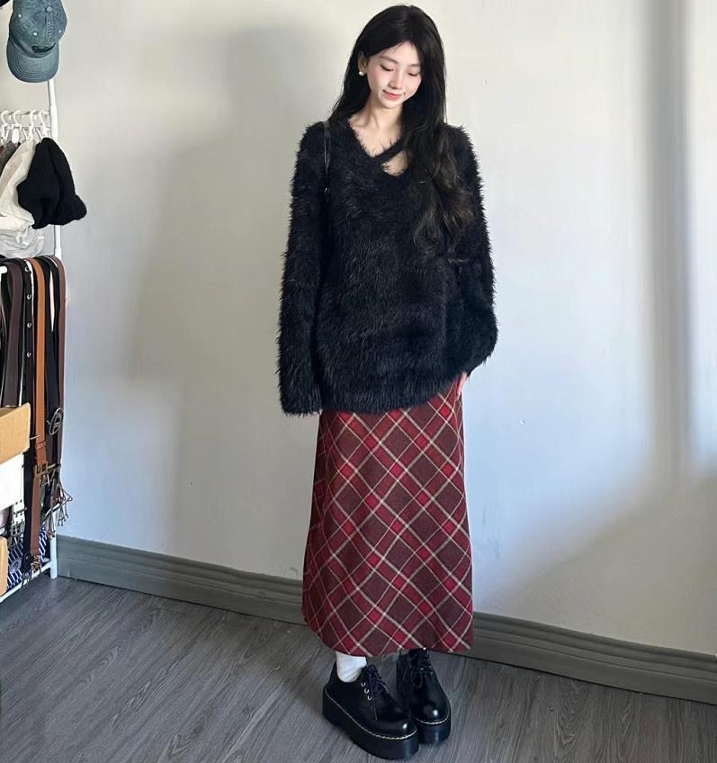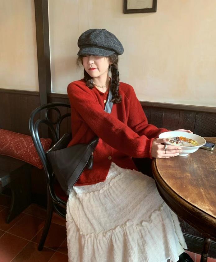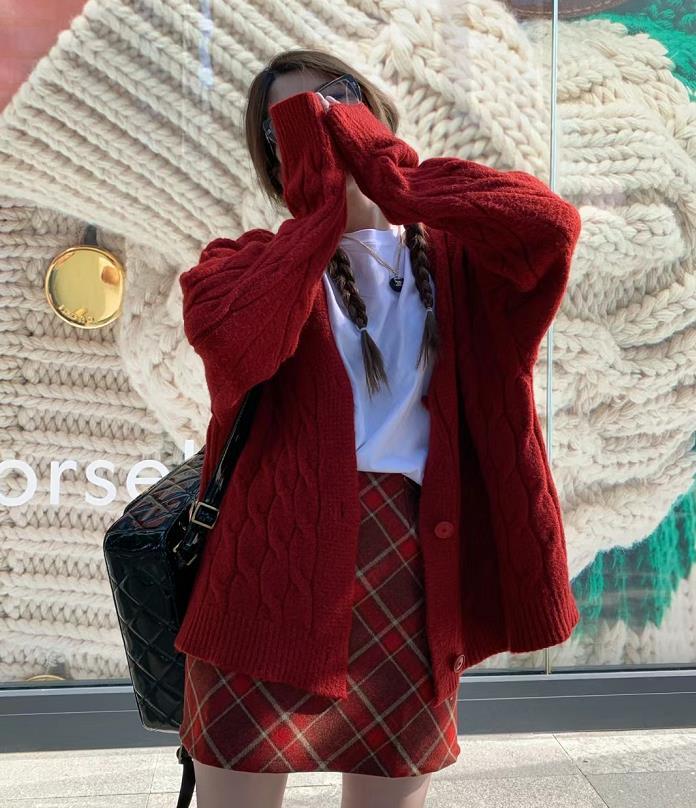 紅色針織開衫,穿起來真的很洋氣喜慶,軟軟糯糯的材質,最舒服保暖了,搭配白色t恤和格紋半裙,可好看了。