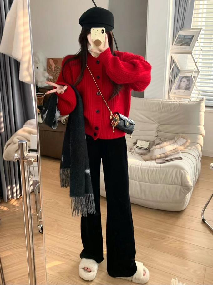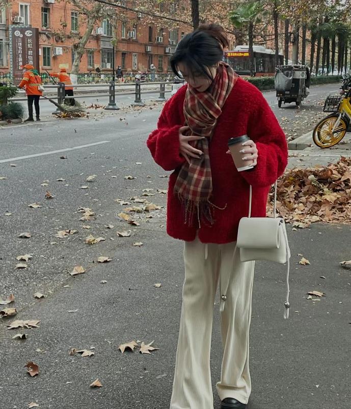 紅色羊羔毛外套,毛絨絨的面料,不僅摸着手感舒服,還很保暖,搭配奶白色針織長褲,整個人都變得溫柔起來了。