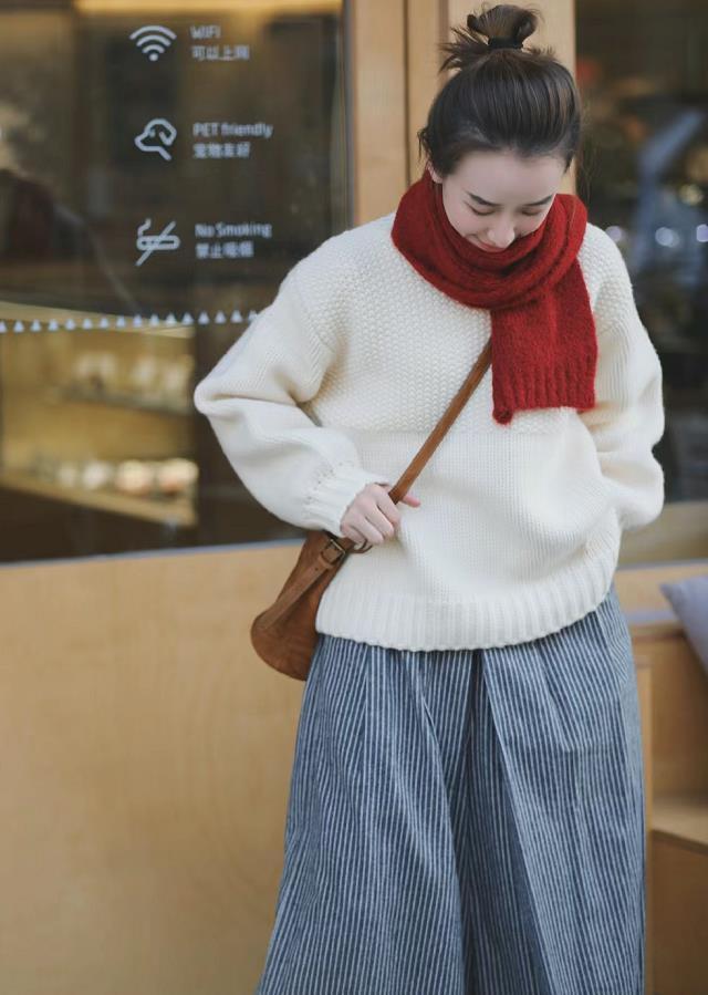 奶白色粗針織毛衣,寬鬆的版型,穿起來可顯瘦了,紅色圍巾隨意圍在脖子上,增加了慵懶感,最重要的是保證了穿着溫度。