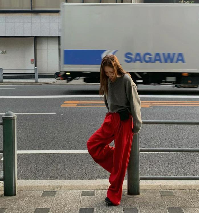 灰+紅,這兩種顏色組合在一起,也是非常不錯,落肩毛衣搭配紅色闊腿褲,妥妥的大女主,走起路來都帶風的那種。