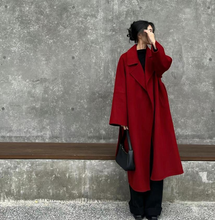 紅色大衣實在是太太太美了,基礎款紅色長大衣,穿起來非常大方又顯高級,寬鬆的版型下,不僅顯瘦還藏肉。內搭黑色打底和黑色長褲,視覺上瞧着就非常顯瘦。