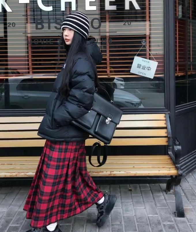 黑+紅的穿搭,簡直是絕了,黑色的連帽羽絨服,很經典百搭,關鍵是穿起來非常顯瘦。搭配紅格子半身長裙,那種屬於冬日的氛圍感就出現了。